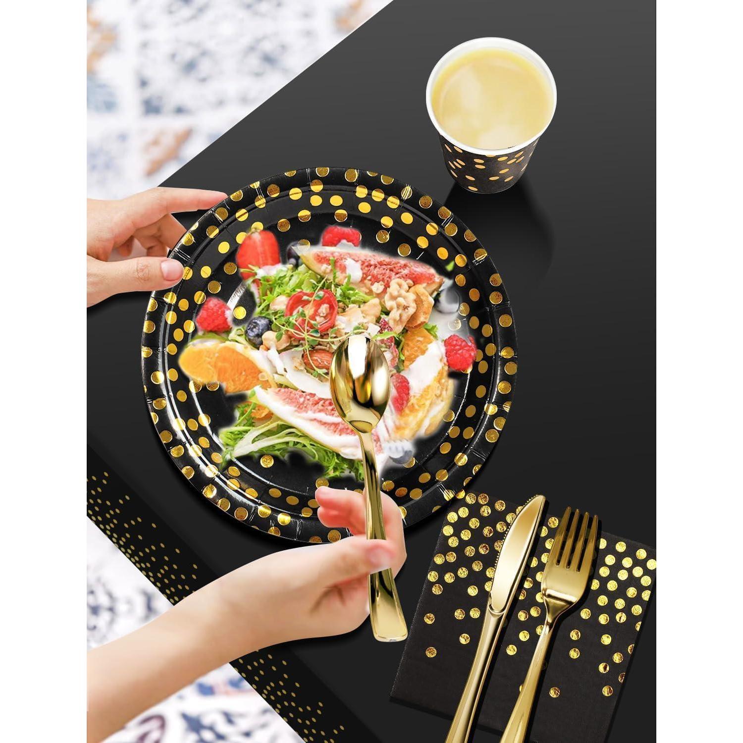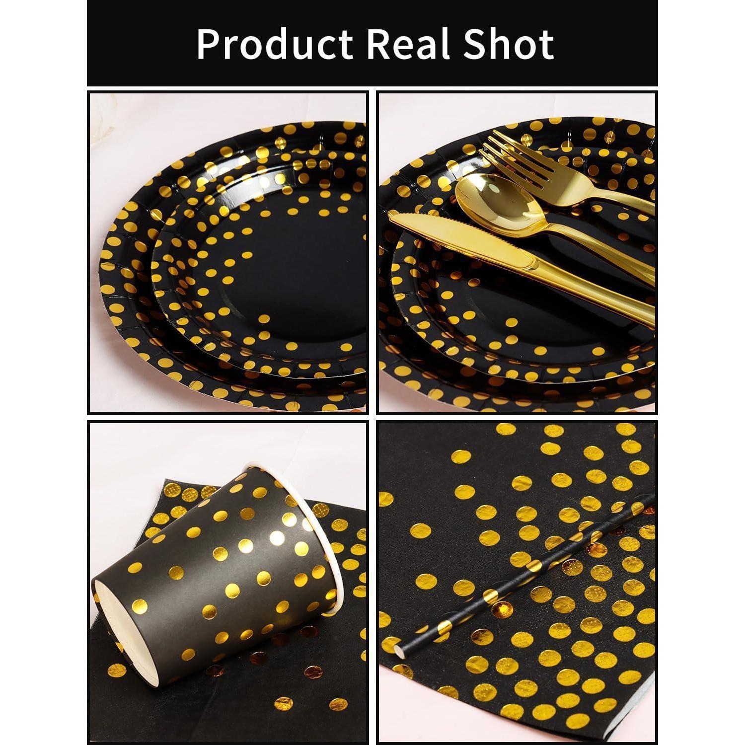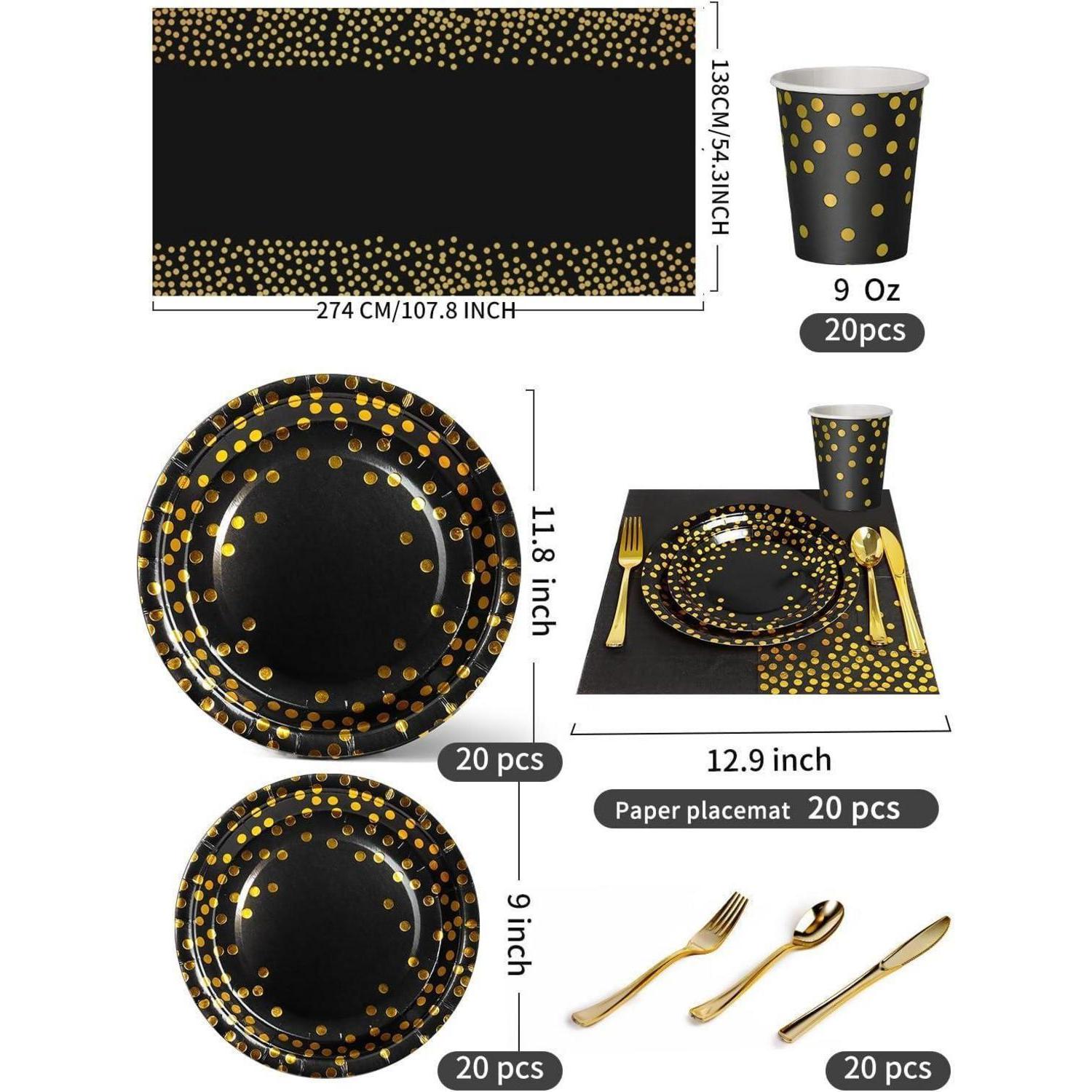 ????【Qualitätsgarantie】Bitte besuchen Sie den Nkaiso Store, um mehr neues Partygeschirr zu erhalten. Wir bieten 60 Tage Qualitätsgarantie auf diesen Artikel. Bei Problemen wenden Sie sich bitte direkt per E-Mail an den Verkäufer. ????【Groß für Jede Gelegenheit】Hochzeiten, Geburtstage, Jahrestage, Junggesellinnenabschiede, Babypartys, Familientreffen, Brautduschen, Junggesellenabschiede, Promotionen, Grillabende, Picknicks, Abendessen im Büro und jede andere Feier! ????【Goldenen Punkten-Design】Unser Partygeschirr verwendet Goldenen Punkten-Design. Das elegante Design mit goldenen Punkten zieht die Aufmerksamkeit der Gäste auf sich und verleiht Ihrem Bankett mehr Geschmack. ????【Hochwertige Materialien】Dieses wunderschöne Partygeschirr besteht aus hochwertigen, schweren Papiermaterialien, die das Geschirrset fest, einweichsicher, schnittfest und langlebig machen. Das Geschirrset ist 100% lebensmittelecht, ungiftig und sicher für jede Party. Hinweis: Bitte stellen Sie die Teller und Tassen nicht in die Mikrowelle. ????【20 Gäste Partygeschirr】Dieses Partygeschirr enthält alles, was Sie für bis zu 20 Gäste benötigen: 20 Speiseteller (9"), 20 Dessertteller (7"), 20 Servietten, 20 Becher, 20 Löffel, 20 Sätze Gabeln und 20 Messer. 1 Stück Tischdecke. Verwenden Sie dieses exquisite Partygeschirr, um Ihre Feier perfekt zu machen.