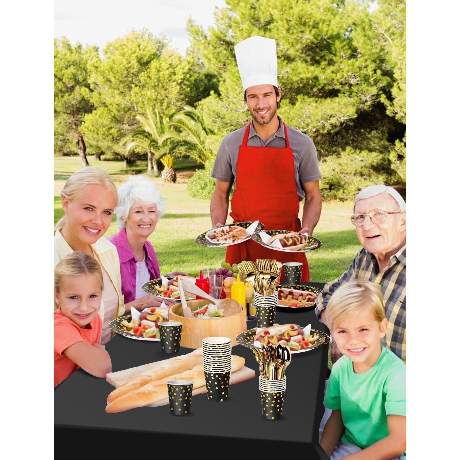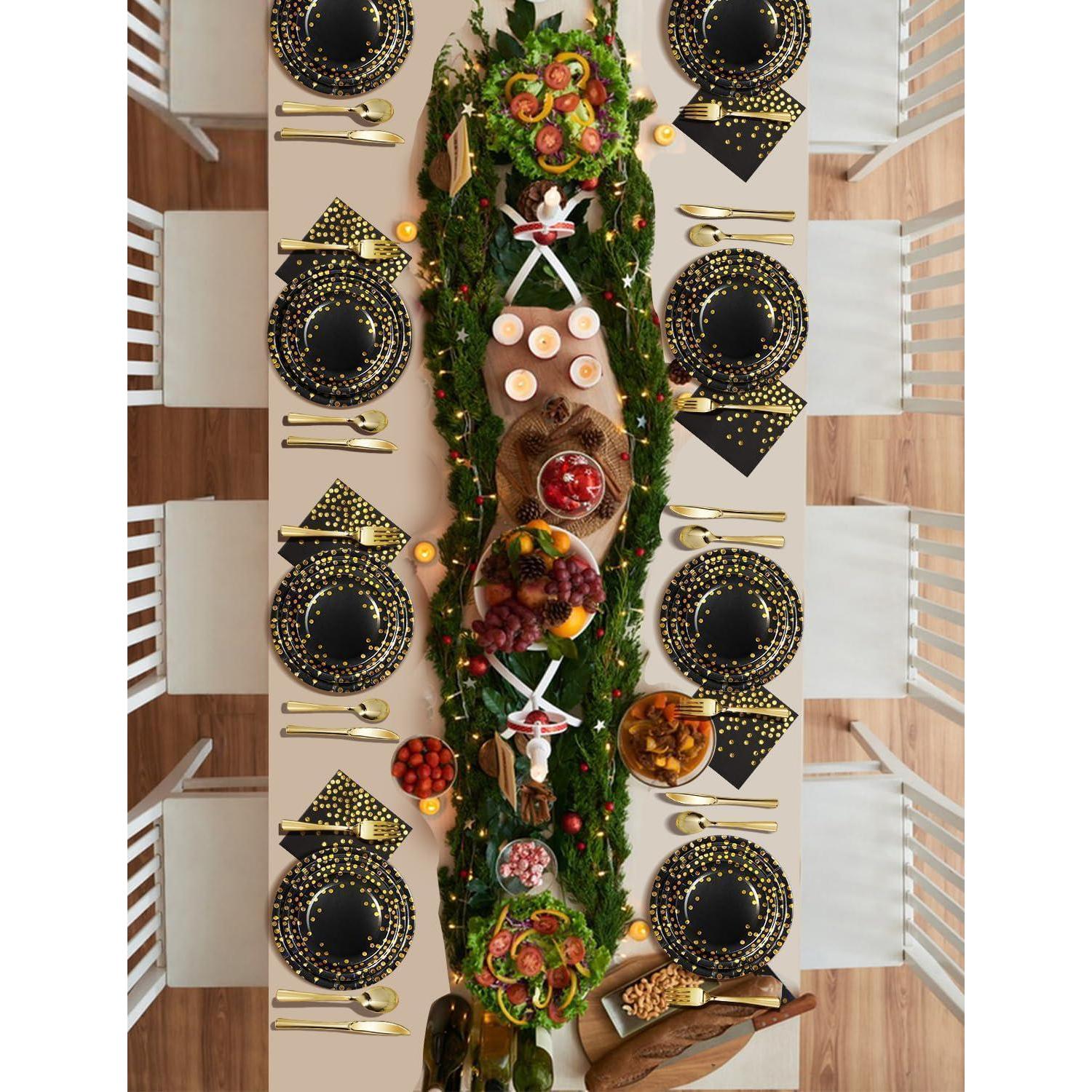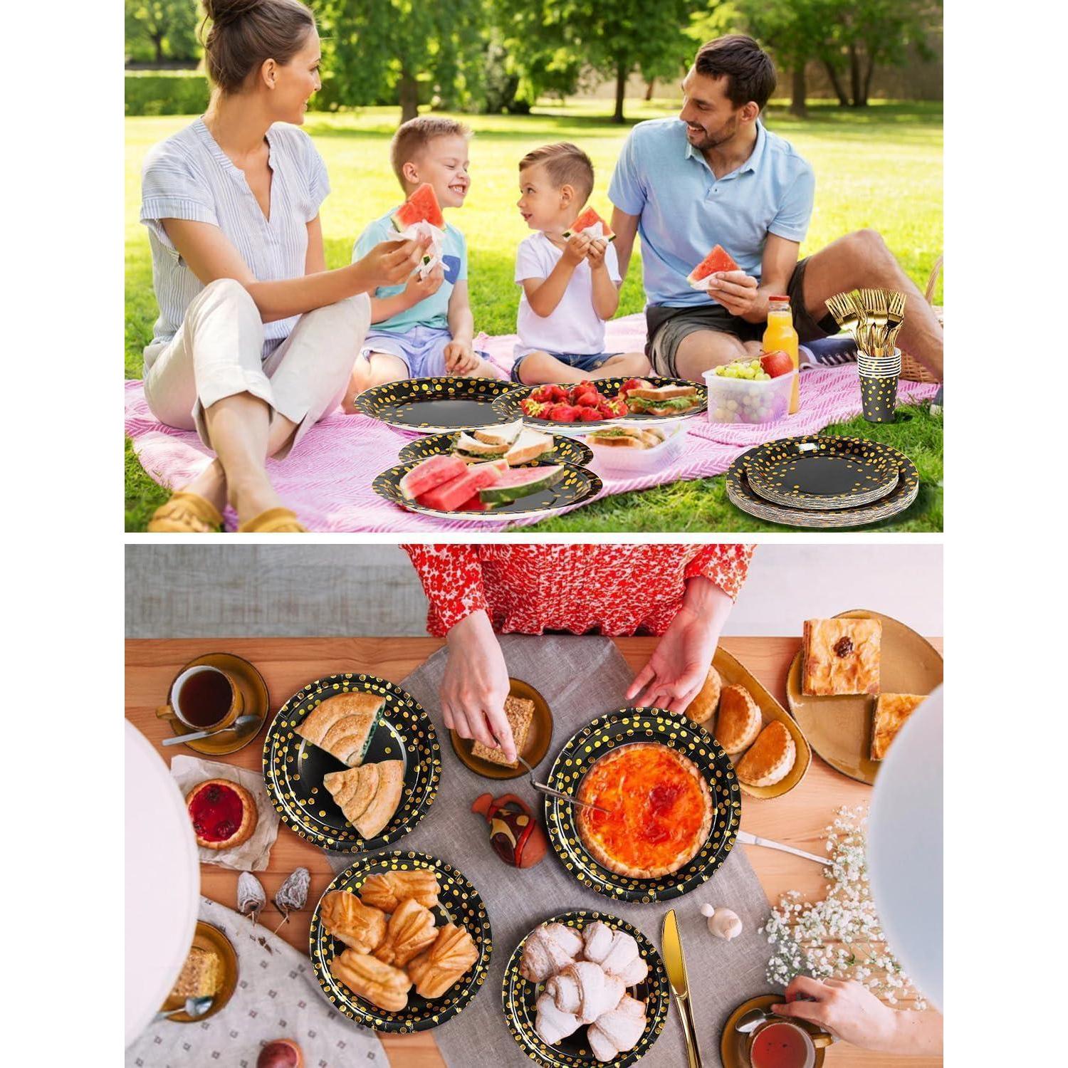 ????【Qualitätsgarantie】Bitte besuchen Sie den Nkaiso Store, um mehr neues Partygeschirr zu erhalten. Wir bieten 60 Tage Qualitätsgarantie auf diesen Artikel. Bei Problemen wenden Sie sich bitte direkt per E-Mail an den Verkäufer. ????【Groß für Jede Gelegenheit】Hochzeiten, Geburtstage, Jahrestage, Junggesellinnenabschiede, Babypartys, Familientreffen, Brautduschen, Junggesellenabschiede, Promotionen, Grillabende, Picknicks, Abendessen im Büro und jede andere Feier! ????【Goldenen Punkten-Design】Unser Partygeschirr verwendet Goldenen Punkten-Design. Das elegante Design mit goldenen Punkten zieht die Aufmerksamkeit der Gäste auf sich und verleiht Ihrem Bankett mehr Geschmack. ????【Hochwertige Materialien】Dieses wunderschöne Partygeschirr besteht aus hochwertigen, schweren Papiermaterialien, die das Geschirrset fest, einweichsicher, schnittfest und langlebig machen. Das Geschirrset ist 100% lebensmittelecht, ungiftig und sicher für jede Party. Hinweis: Bitte stellen Sie die Teller und Tassen nicht in die Mikrowelle. ????【20 Gäste Partygeschirr】Dieses Partygeschirr enthält alles, was Sie für bis zu 20 Gäste benötigen: 20 Speiseteller (9"), 20 Dessertteller (7"), 20 Servietten, 20 Becher, 20 Löffel, 20 Sätze Gabeln und 20 Messer. 1 Stück Tischdecke. Verwenden Sie dieses exquisite Partygeschirr, um Ihre Feier perfekt zu machen.