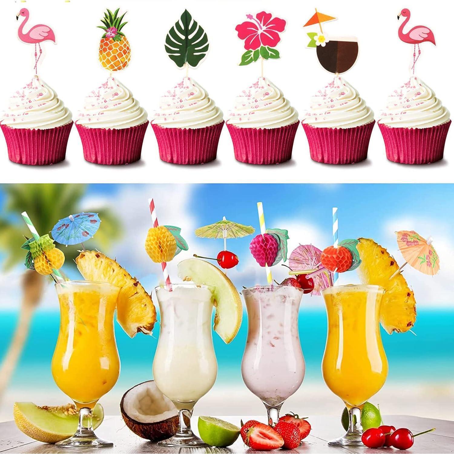 Der Inhalt des Sets umfasst 9 Tischröcke, 1 Saft Folienballon, 1 Kokosnussbaum Folienballon, 1 ALOHA Folienballon, 15 tropische Palmenblätter, 24 Cupcake Topper, 31 Latexballons, 12 künstliche Hibiskusblüten, 24 Regenschirm Food Topper, 24 3D Papierstrohhalme und 21 Foto Requisiten. Alles, was du für eine gelungene Hawaii Party Deko benötigst, ist in diesem Set enthalten.