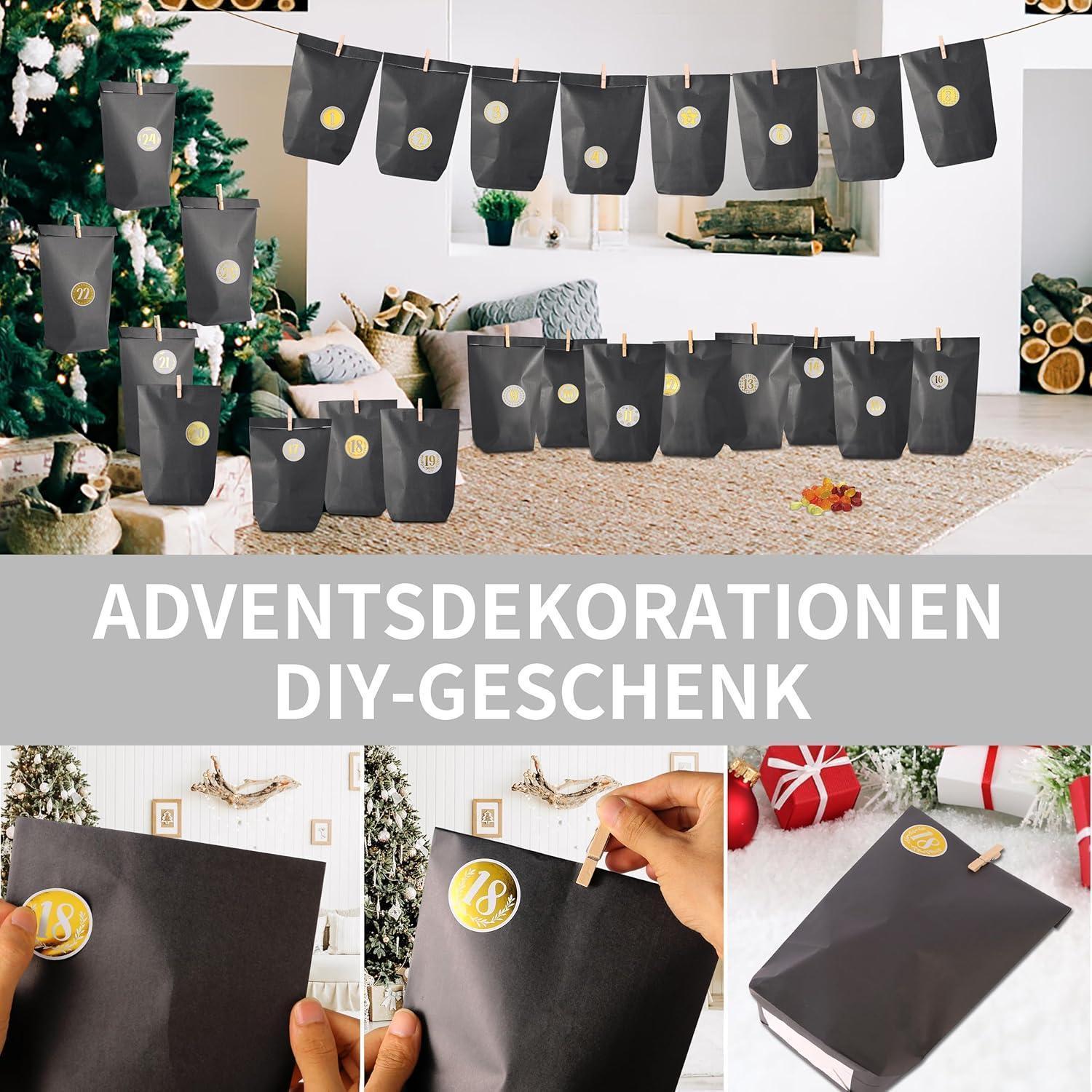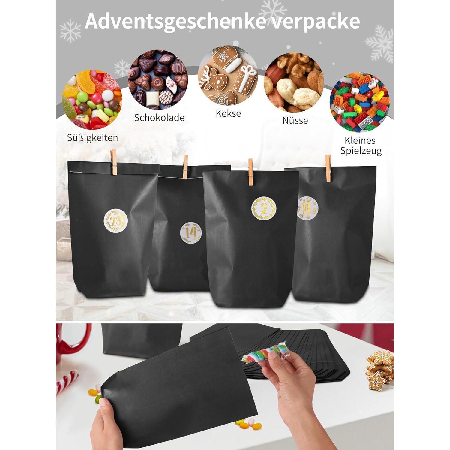 Geschenktüten-Set: Enthält 25 schwarze Geschenktüten, 24 Zahlenaufkleber, 26 Klammern und Juteschnur zur Herstellung des Adventskalenders.