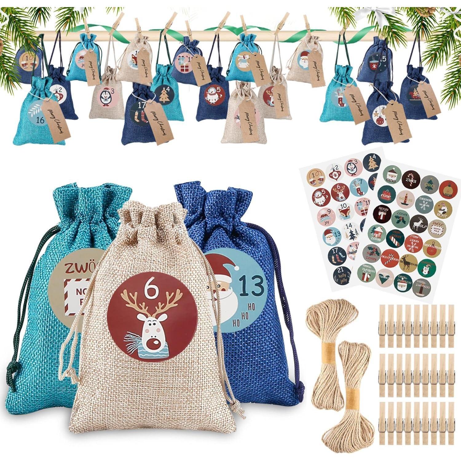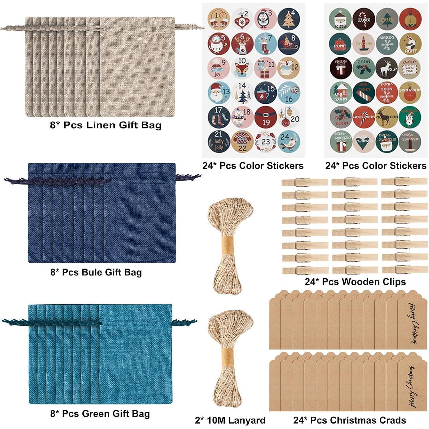 Komplettes Set - Enthält 24 Säckchen in drei Farben, Aufkleber, Holzklammern, Weihnachtskarten und Hanfseil