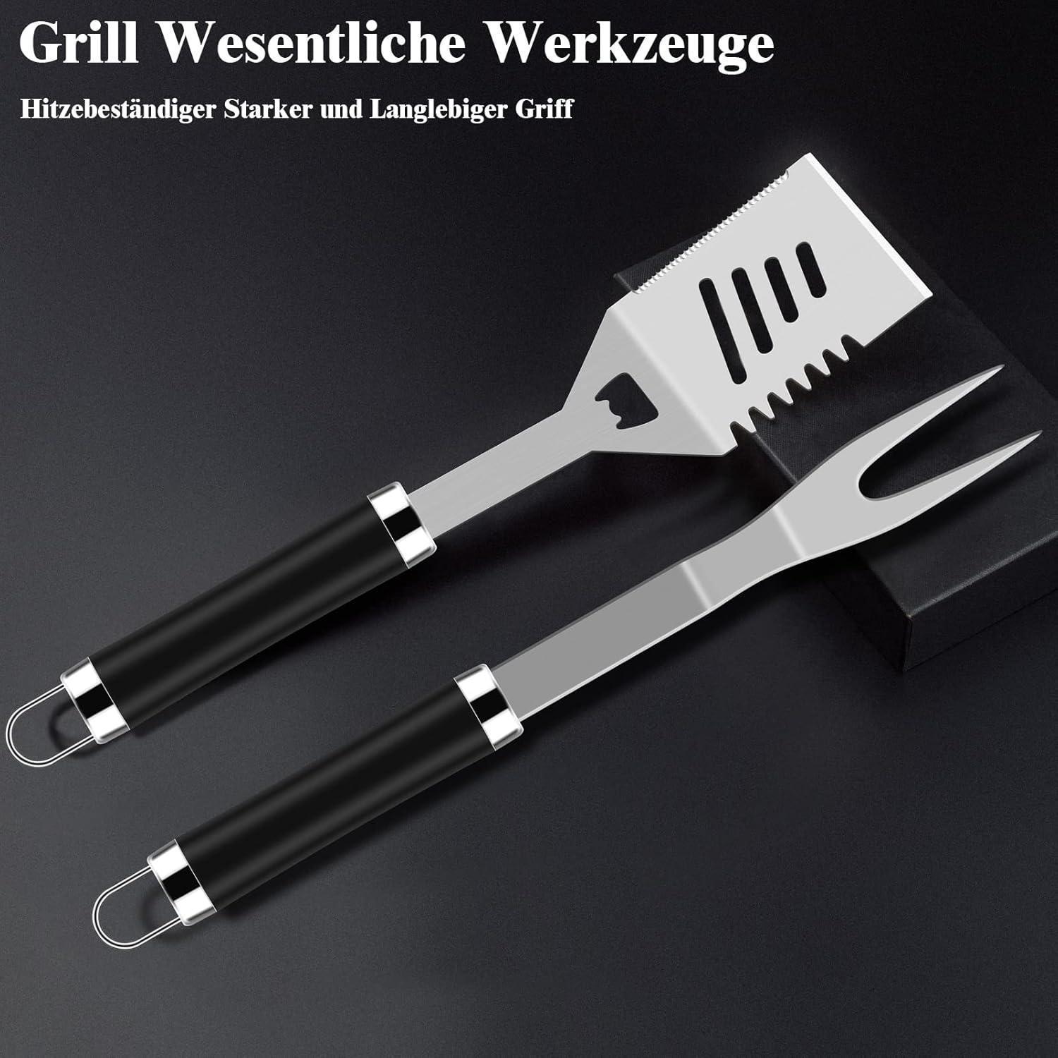 Das Grillzubehörset besteht aus hochwertigem Edelstahl, der hitzebeständig, korrosionsbeständig und langlebig ist. Mit einem 14-Zoll langen Griff sind die Werkzeuge einfach zu bedienen. Die spülmaschinenfesten Materialien erleichtern die Reinigung und Aufbewahrung, während das Hakendesign es ermöglicht, die Werkzeuge problemlos aufzuhängen.
