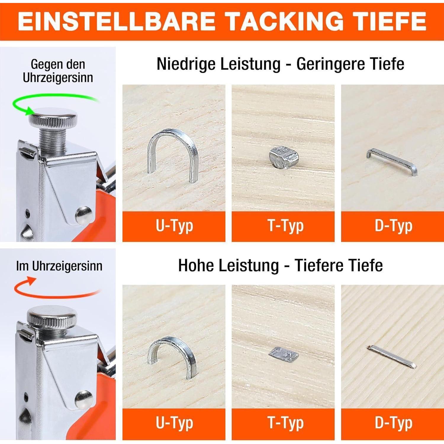 Der Handtacker besteht aus robustem Metall, was eine lange Lebensdauer gewährleistet. Der ergonomische Griff sorgt für eine komfortable Handhabung, auch bei längeren Arbeitsstunden. Durch den Tiefeneinstellknopf können Sie die Schusskraft einfach anpassen, um präzise Resultate zu erzielen, egal ob beim Dekorieren, Möbelbau oder Reparieren.