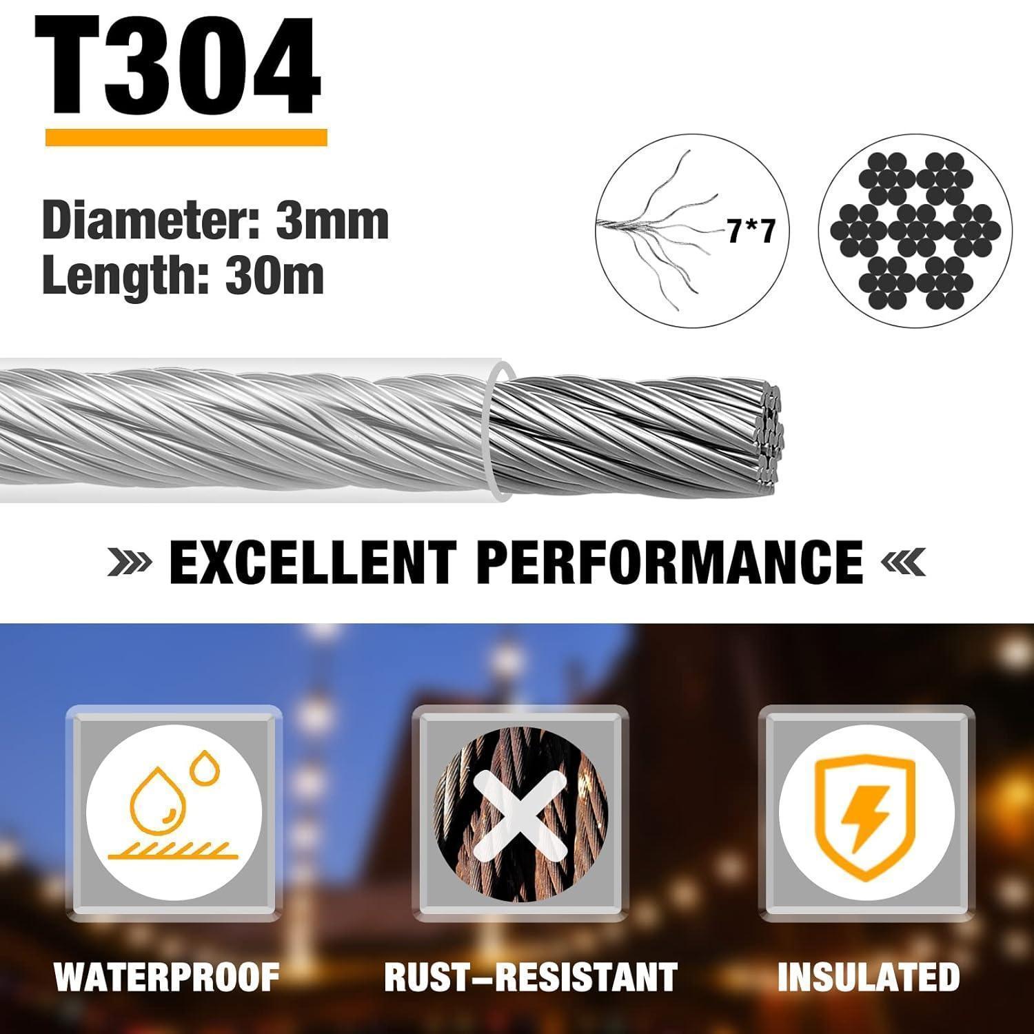 Edelstahl Stahlseil System: Umfassendes Set mit 30M 3mm 304 Edelstahl Drahtseil und umfangreichem Zubehör.