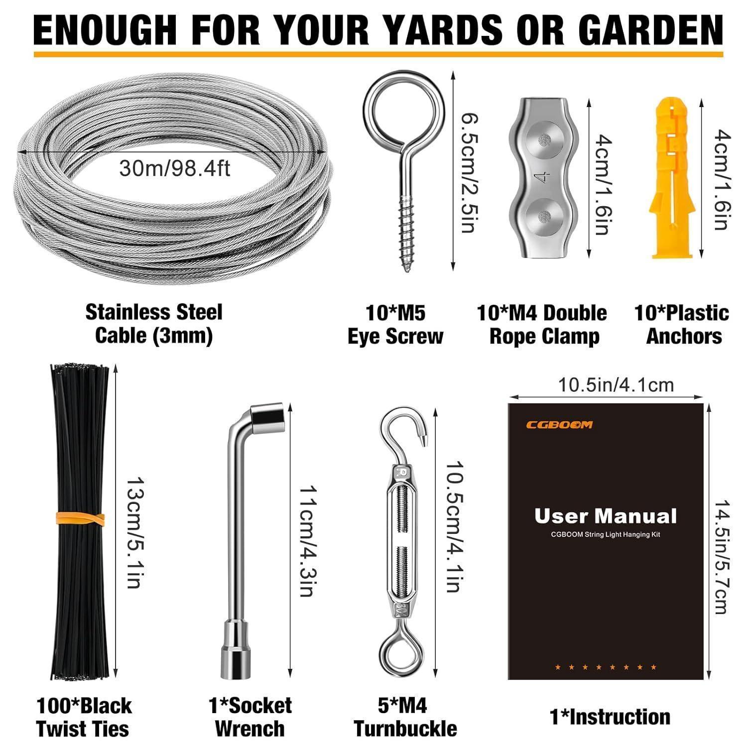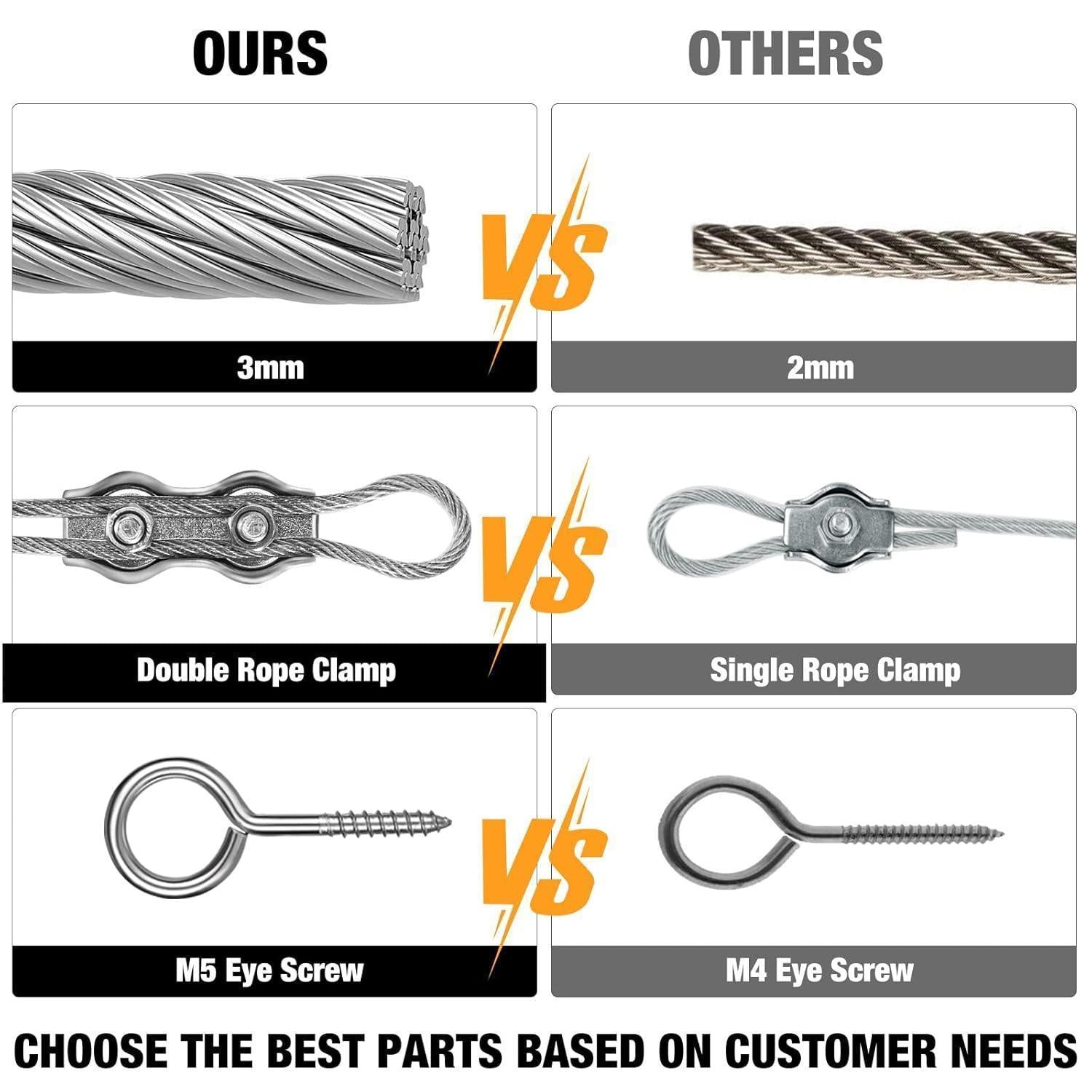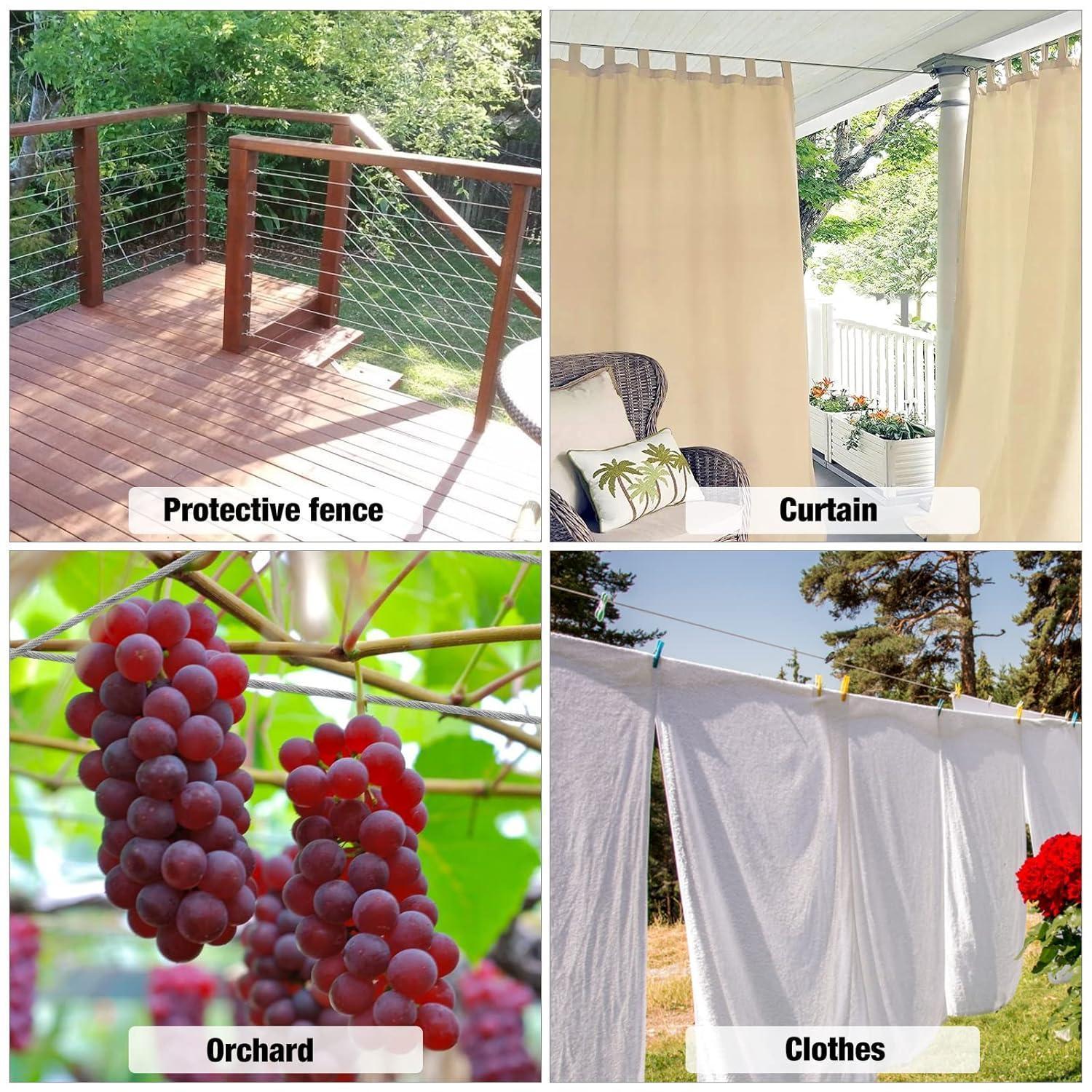 Edelstahl Stahlseil System: Das Drahtseil-Set enthält hochwertiges 304 Edelstahl Drahtseil mit ummantelter Oberfläche für Korrosionsbeständigkeit. Mit Spannschlössern, Augenschrauben und Kabelbindern ausgestattet, ist dieses Set perfekt für verschiedene Anwendungen geeignet.