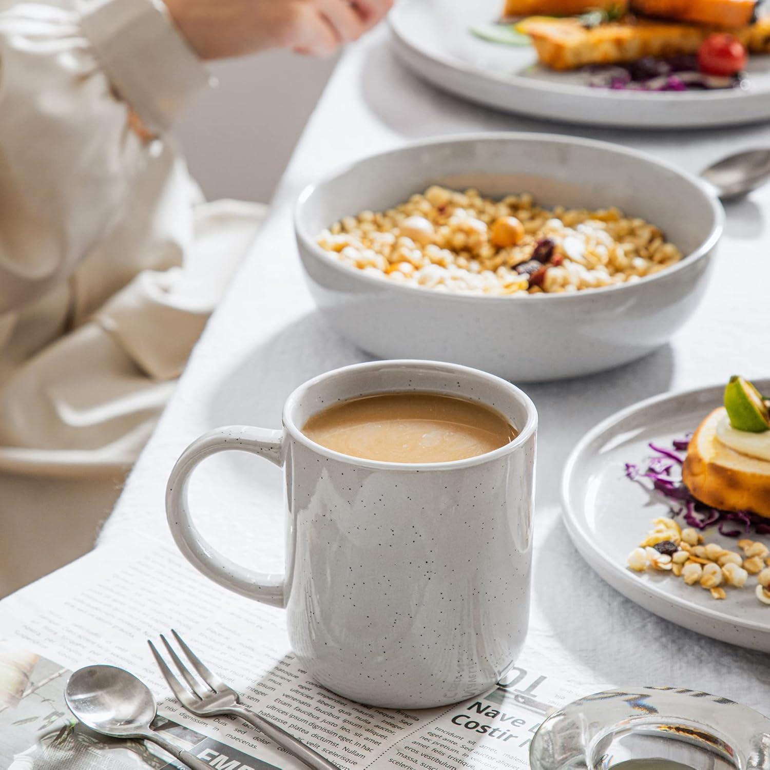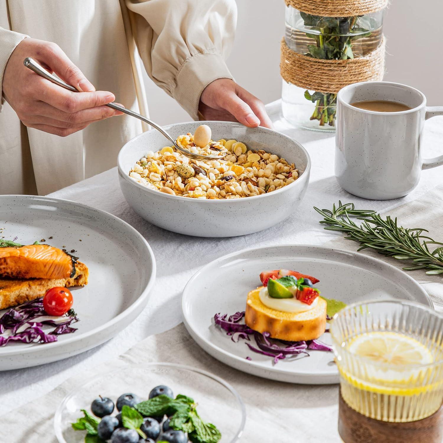 Mehre Ergänzungen von vancasso. Weitere andere Serie von der Marke vancasso wie NATSUKI, HARUKA, ALLEGRO, PLUVO, GUTO, SEESAMI, BUBBLE, MODA, LENTO, MANDALA, MACARON, TULIP, BELLA, BONBON, BONITA, JASMIN, NAVIA sind auch im unseren Shop erhältlich. Einwandfreier Kundendienst. Für jedes Problem bieten wir optimale Lösungen an, einfach melden Sie sich per E-Mail bei uns. Beeindrukende Geschenkidee. Als anständiges Geschenk ist das tolles Essgeschirr Set im Skandinavien Design kombiniert auf harmonische Weise typische runde Formen mit einem farbenfrohen modernen Aussehen, perfekt für alle Altersgruppen, Familien und Freunde. Super sicher und fest verpackt;. Breite Verwendung und Einfache Reinigung. Dieses Kombiservice Set eignet sich nicht nur für festliche Anlässe, wie für Familienfeier, Restaurant, Party, Bankett und andere Geschäftsräumen, sondern auch für den täglichen Gebrauch. Mikrowellengeeignet, spülmaschinenfest, kratz- und schnittfest, säure- und fleckenresistent und pflegeleicht. Individuelles modernes Design. Aus hochwertigem und umweltfreundlichem Steingut ist das Geschirrset von Hand gefertigt. Einzigartige schwarze Sesam Oberfläche, ungewöhnliche weiße Kante, wunderschönes skandinavisches Design, vielfältige zarte Farbungen und stilvolle moderne Optik entsteht eine angenehme Harmonie, was Ihren Tisch etwas schick machen. Komplette Kollektionen. 32-teiliges SESAM Tafelservice Set im modernen Aussehen besteht aus 8 Müslischalen Ø 17,8 cm, 800ml, 8 Desserttellern Ø 20 cm, 8 Speisetellern Ø 26,5 cm und 8 Kaffeetassen, 330ml; Dank des naturfarbenen Design kann unser Geschirrset hervorragend mit anderen Serien kombiniert werden.