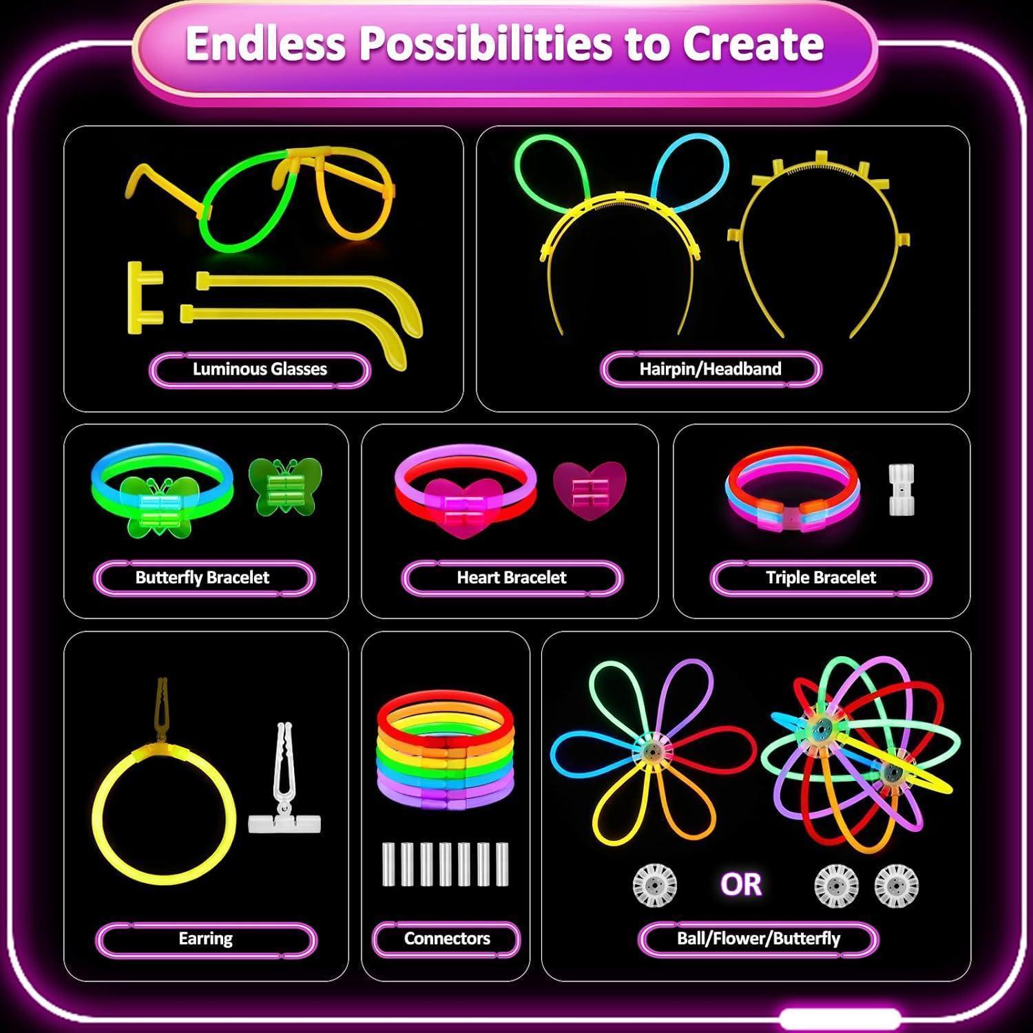Das Set enthält insgesamt 150 Neon Leuchtstäbe und 176 Verbindungsstücke, darunter Verbinder, Kopfbänder, Brillenstecker und mehr. Diese hochwertigen Leuchtstäbe können zu Halsketten, Armbändern, Ringen und anderen Accessoires verbunden werden, um individuelle Partydekorationen und Accessoires zu erstellen. Lassen Sie Ihrer Kreativität freien Lauf!