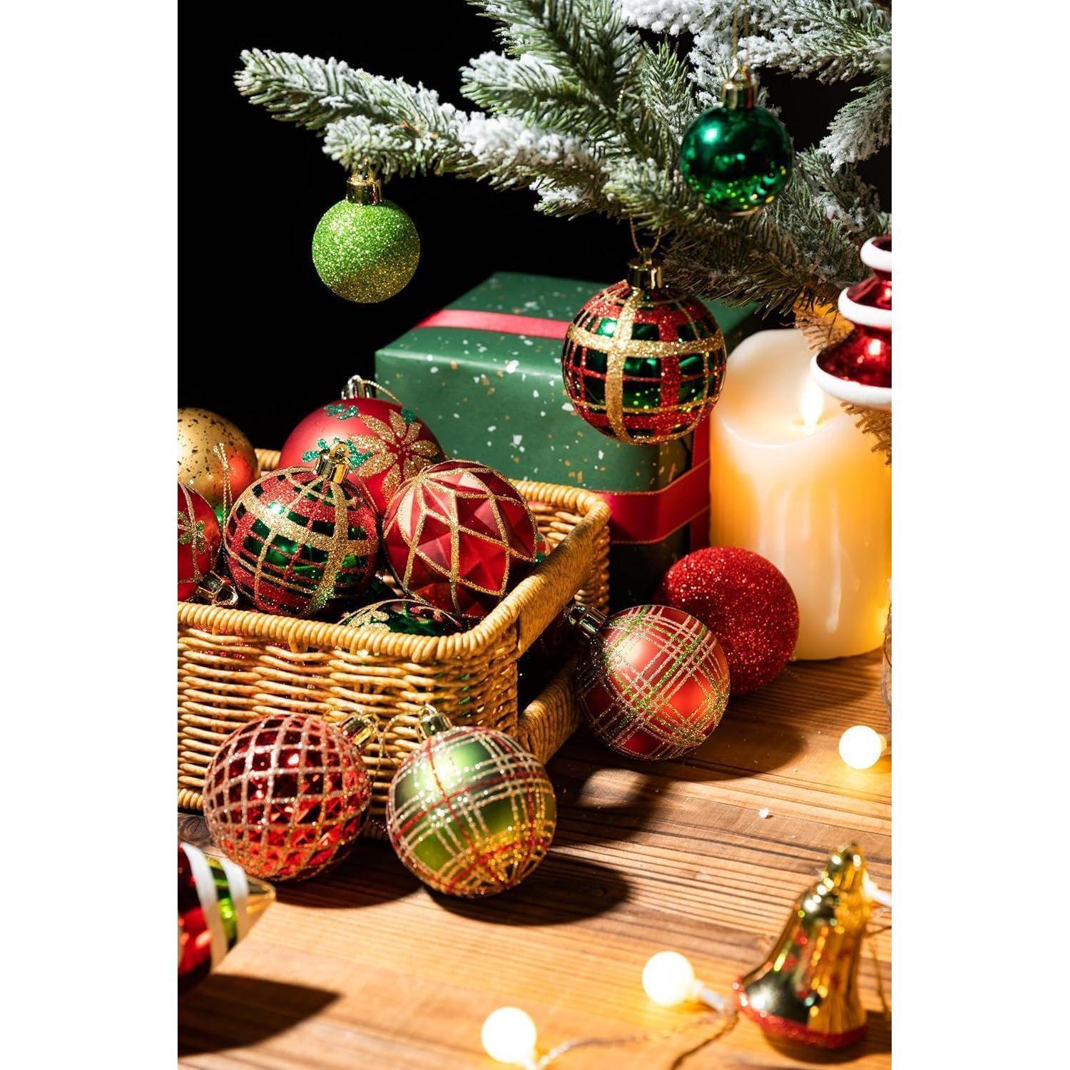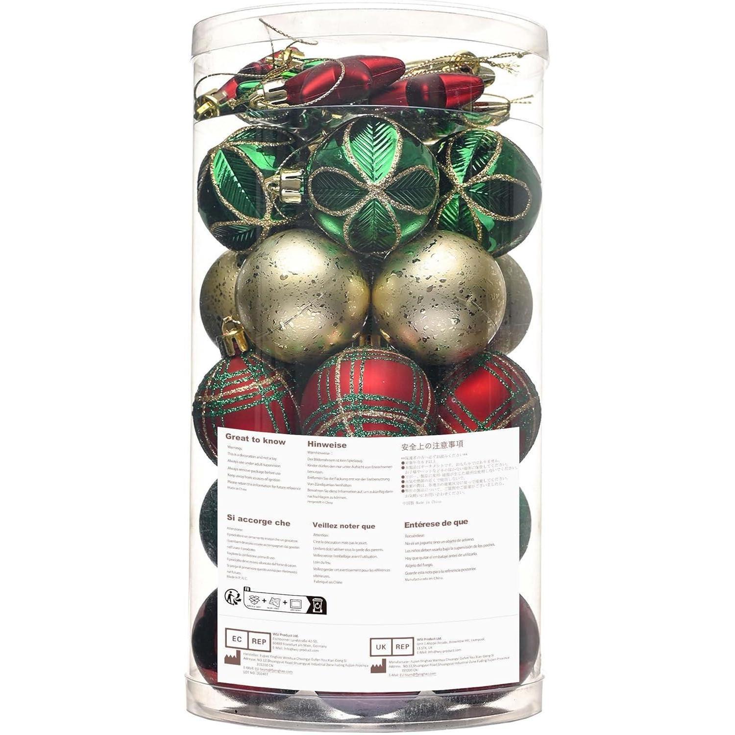 Mit den Valery Madelyn Weihnachtskugeln holen Sie sich ein Stück festliche Freude nach Hause. Das Set besteht aus 35 bruchsicheren Christbaumkugeln mit einem Durchmesser von 5 cm, die perfekt zum Landstraßen-Thema in Rot, Grün und Gold passen. Jede Kugel ist mit einem vorgebundenen Seil ausgestattet, was das Aufhängen an Ihrem Weihnachtsbaum zum Kinderspiel macht.