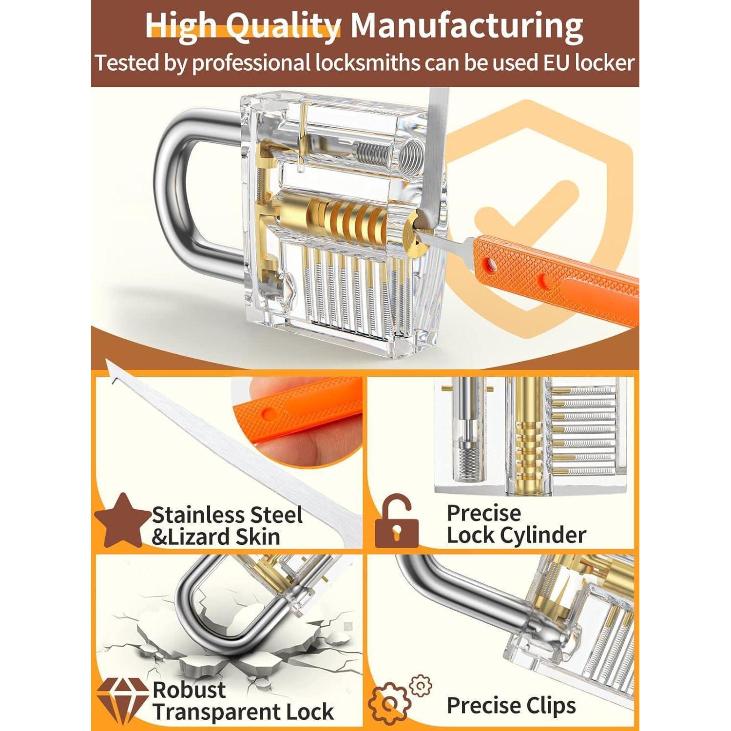 38+4 Teiliges Lockpicking Set, 38-Teiliges Dietrich Set mit 4 Transparentem Trainingsschlössern und Anleitung, für Schlosserei, Anfänger und Profisrleicht