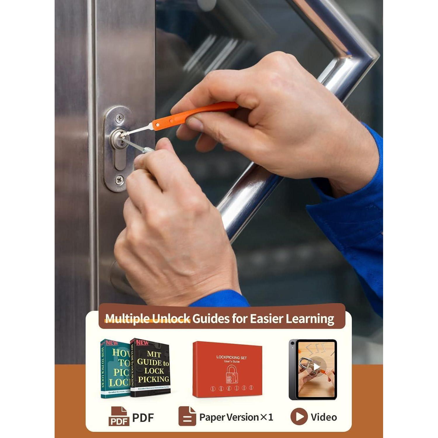 Komplettes Professionelles Dietrich Set: Das 38-teilige Lockpicking Set ist sowohl für erfahrene Schlosser als auch Lernende geeignet. Es beinhaltet 12 hochwertige Haken, 5 Drehmomentwerkzeuge, 4 transparente Trainingsschlösser, Kreditkarten-Kits, Y-Schraubenschlüssel, Verlängerungsstangen, Verriegelungshülse, Nylon-Aufbewahrungstasche und eine professionelle Anleitung. Kontaktieren Sie uns für die elektronische Version des Handbuchs.