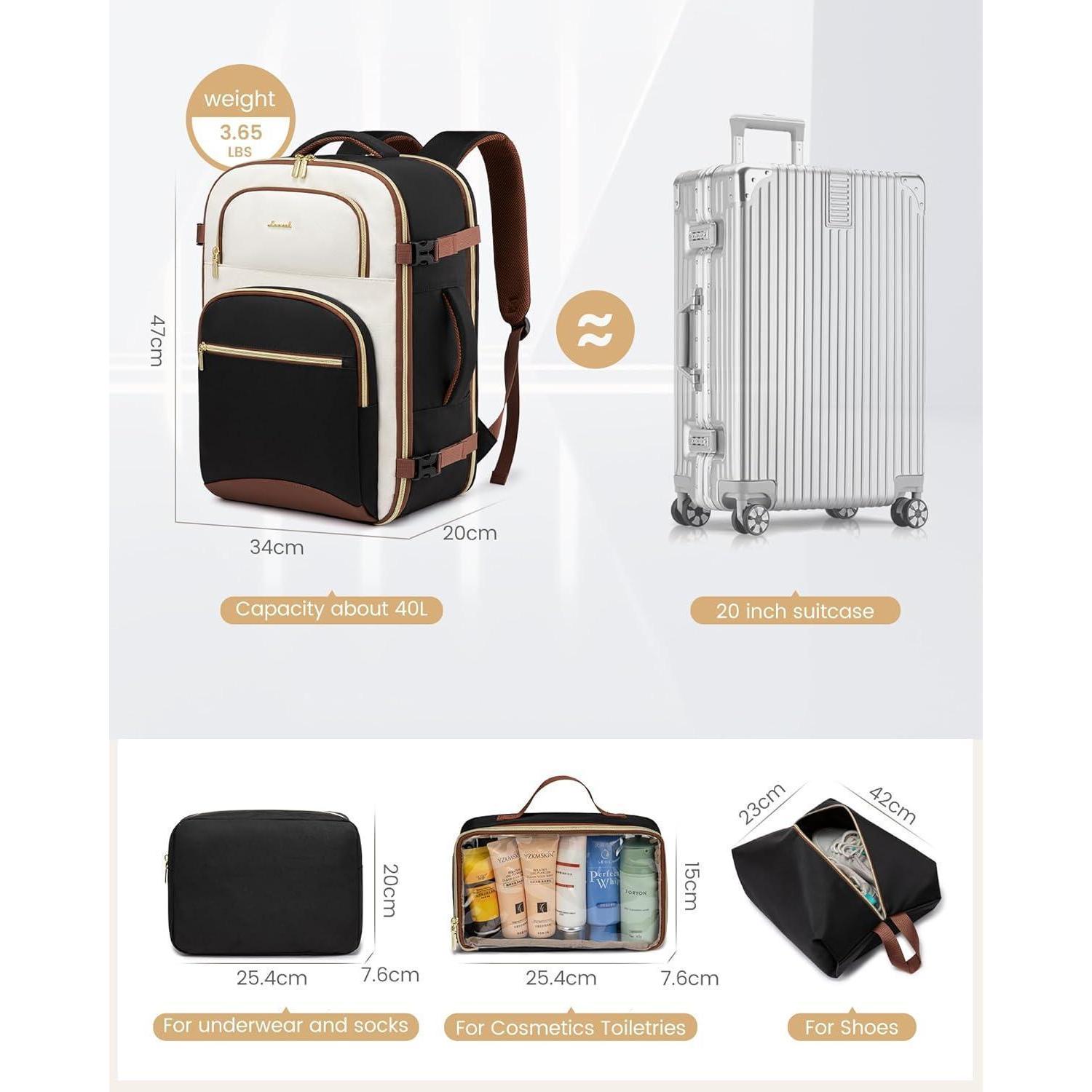 40L Kapazität & 3 Aufbewahrungsbeutel: Mit einem großzügigen Volumen von 40 Litern deckt es Ihre täglichen und Reisebedürfnisse ab. Ausgestattet mit 3 separaten Aufbewahrungsbeuteln (1 Kosmetiktasche, 1 Kleidungstasche, 1 Schuhtasche) für Kosmetika, Elektronik und andere kleine Gegenstände, bleibt alles organisiert.