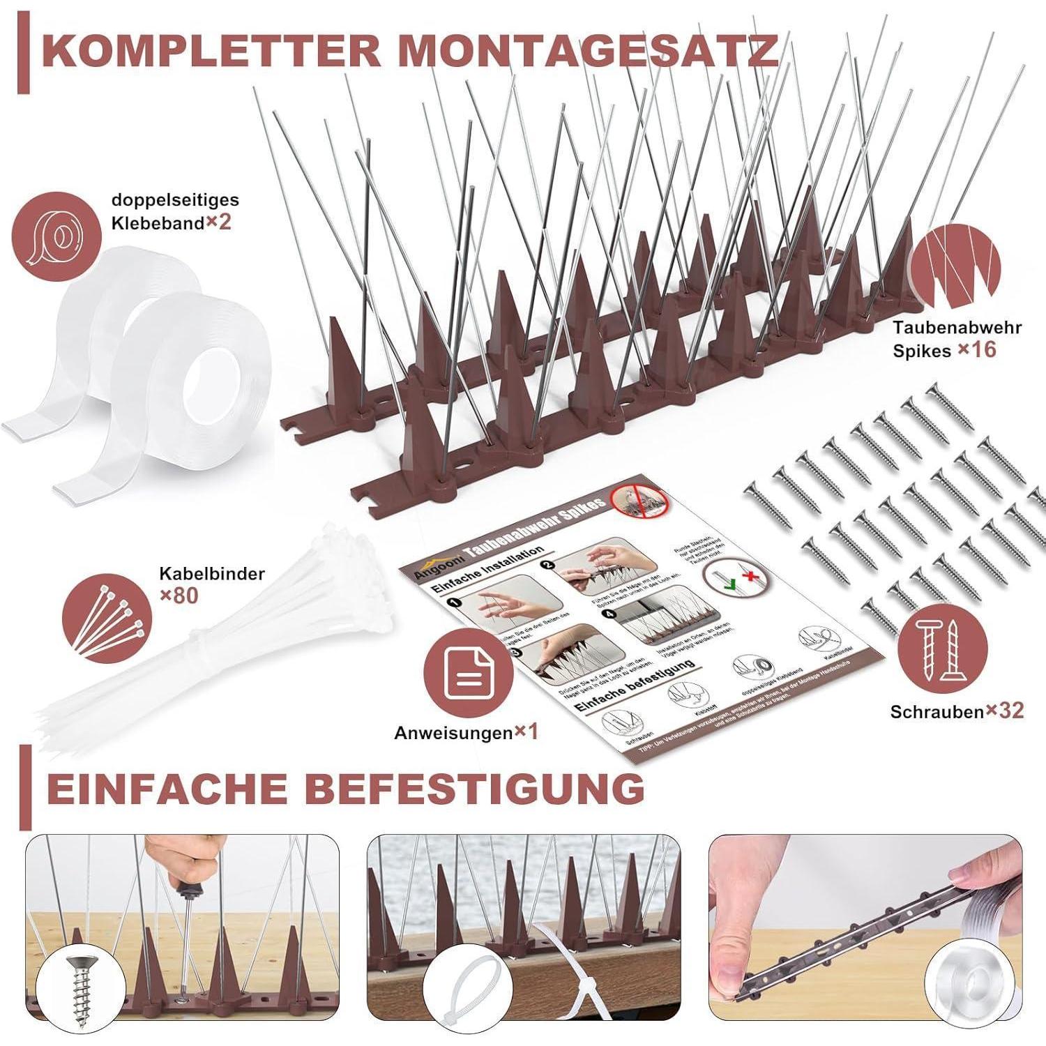 Der komplette Montagesatz enthält alles, was Sie für die Installation benötigen: Schrauben, doppelseitiges Klebeband und Kabelbinder. Mit den mitgelieferten Anweisungen ist die Montage ein Kinderspiel und in wenigen Handgriffen erledigt. Die Taubenabwehr Spikes sind stabil, witterungsbeständig und korrosionsbeständig, sodass sie auch im Freien zuverlässig ihren Dienst tun.