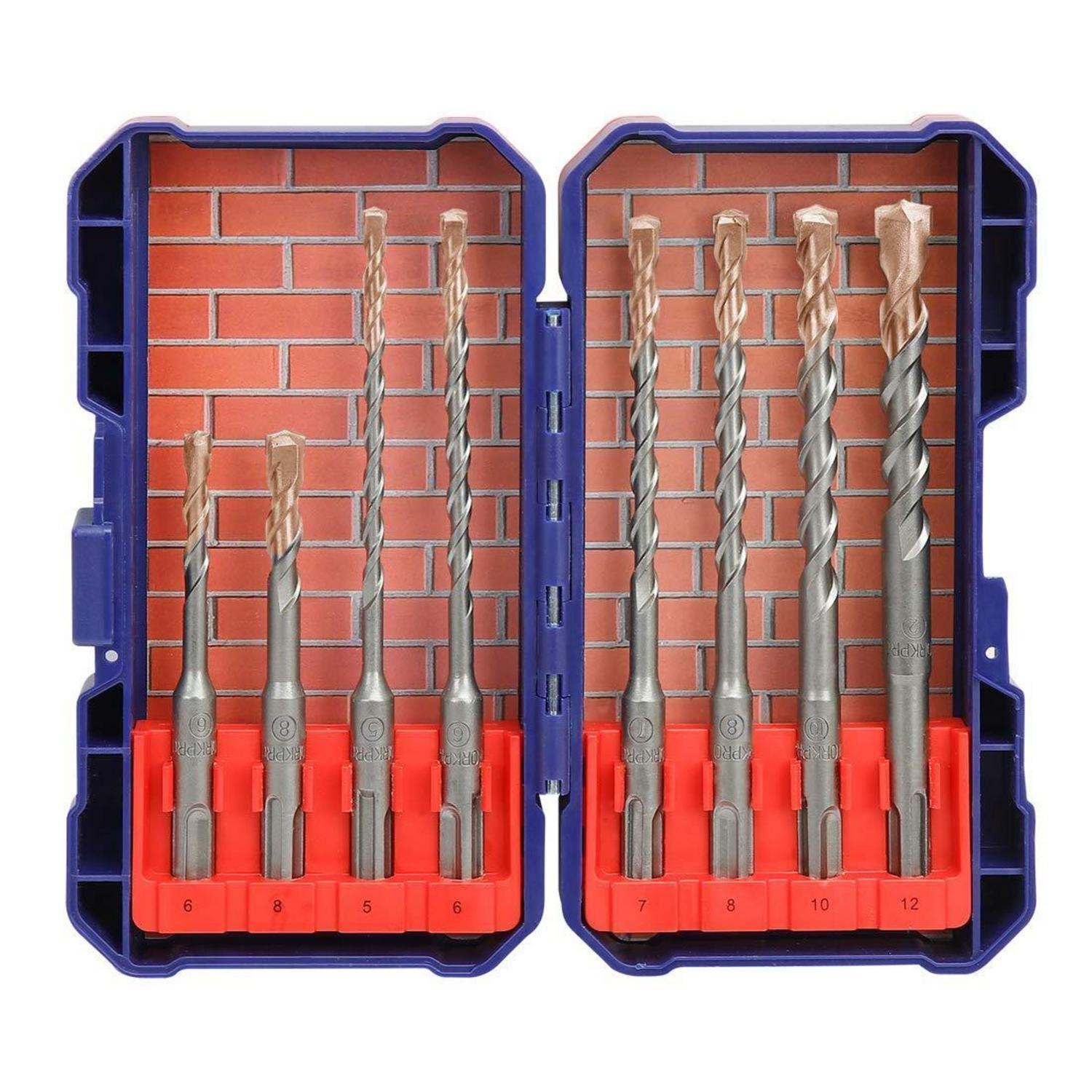 Das WORKPRO Hammerbohrer Set enthält 8 SDS Plus Bohrer mit Durchmessern von Ø6 x 110mm, Ø8 x 110mm, Ø5 x 160mm, Ø6 x 160mm, Ø7 x 160mm, Ø8 x 160mm, Ø10 x 160mm und Ø12 x 160mm, verpackt in einer praktischen Kunststoffbox. Diese speziellen Hammerbohrer eignen sich perfekt zum Bohren in harte Materialien wie Beton, Ziegel, Stein und Mauerwerk.