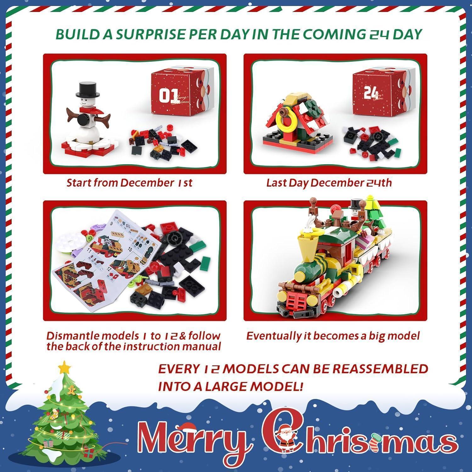 12 in 1 Weihnachtsbausteine Spielzeug: Insgesamt gibt es 24 nummerierte Schachteln, die jeweils Blöcke enthalten, die zu Miniaturen zusammengesetzt werden können. Mit ihnen lassen sich 24 einzelne Modelle bauen. Die 12 spezifizierten Modelle können zu einem größeren Rentierschlitten und die 12 weiteren zu einem Weihnachtszug zusammengesetzt werden. Jedem Baustein liegt eine farbenfrohe Anleitung bei, die den Zusammenbau noch einfacher macht und Kinder, die gerne mit Bausteinen bauen, begeistert.