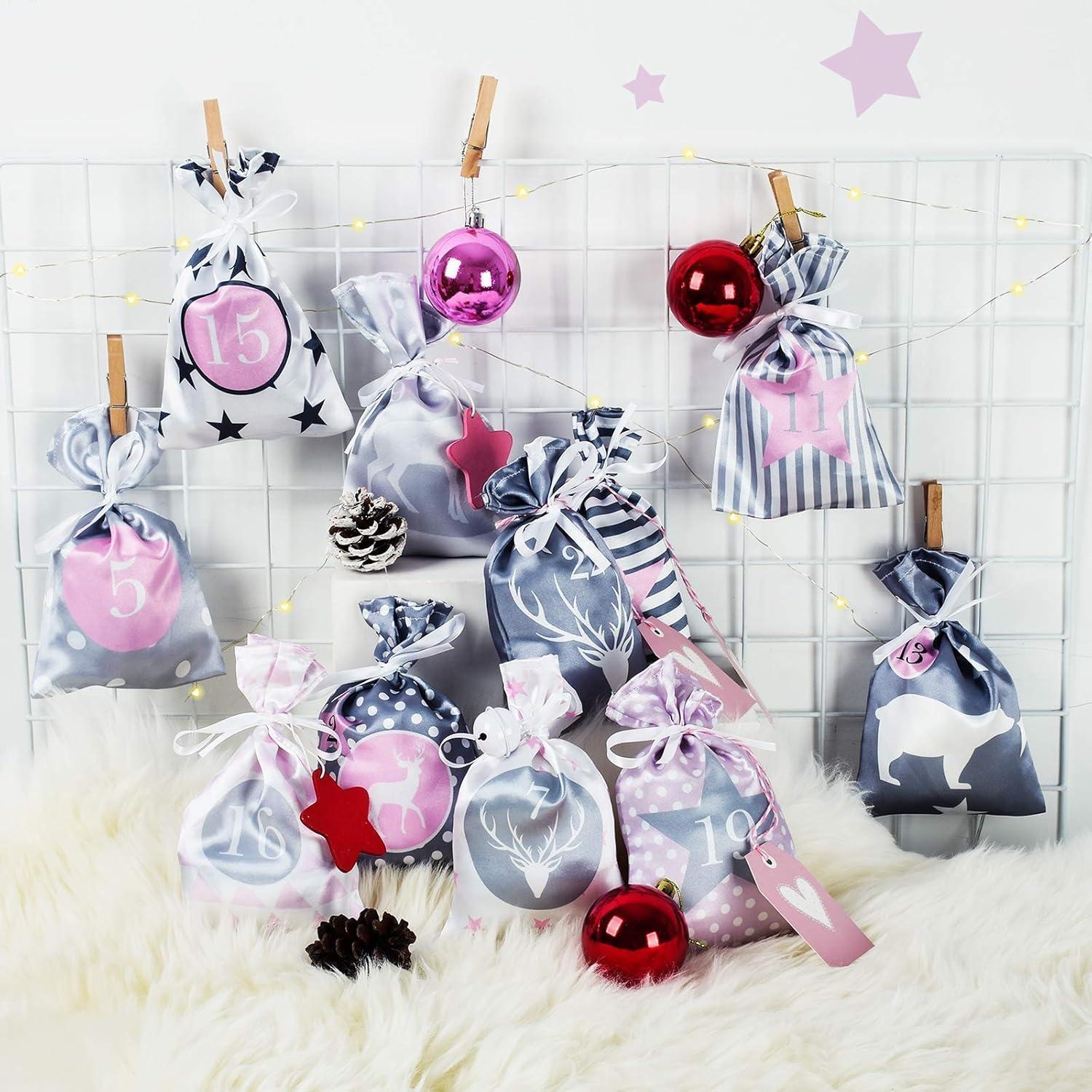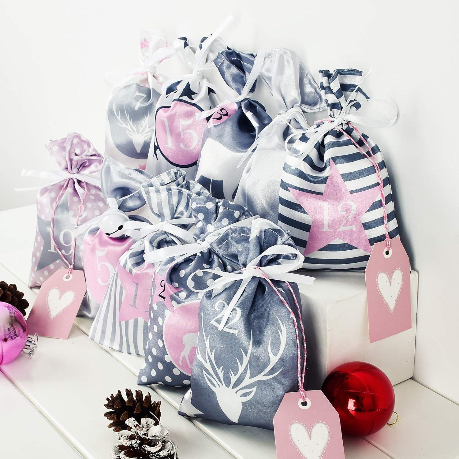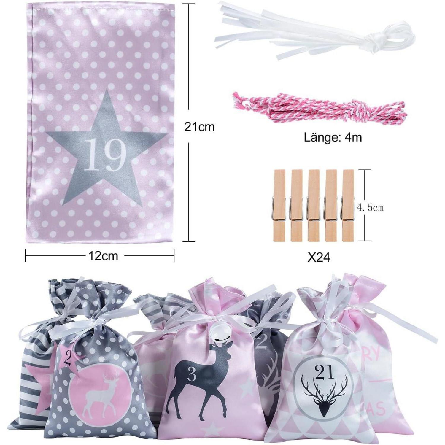 Adventskalender Kette mit 24 Stoffsäckchen Rosa Grau, DIY
