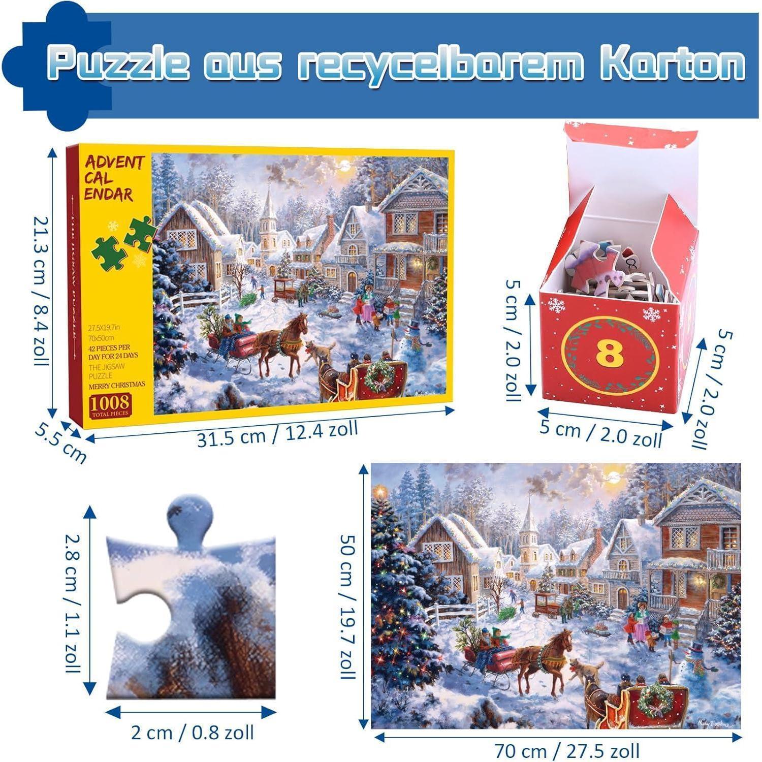 Adventskalender Puzzle Erwachsene: Dieser einzigartige Puzzle-Adventskalender enthält 24 nummerierte Schachteln, die an dem Tag geöffnet werden müssen, der der Nummer entspricht. In jeder Schachtel finden Sie 42 Teile eines Puzzles. Die 42 Teile gehören zu einem bestimmten Abschnitt des Puzzles, und Ihr Ziel ist es, zwischen dem 1. und 24. Dezember jeden Tag einen Abschnitt des Puzzles fertigzustellen.