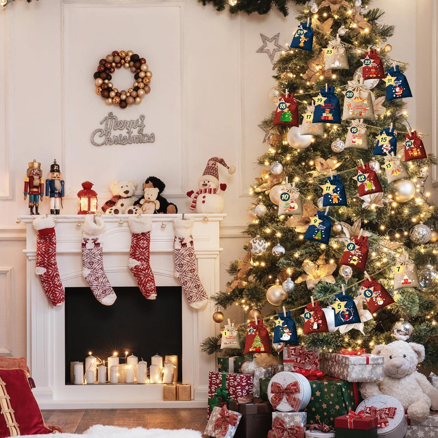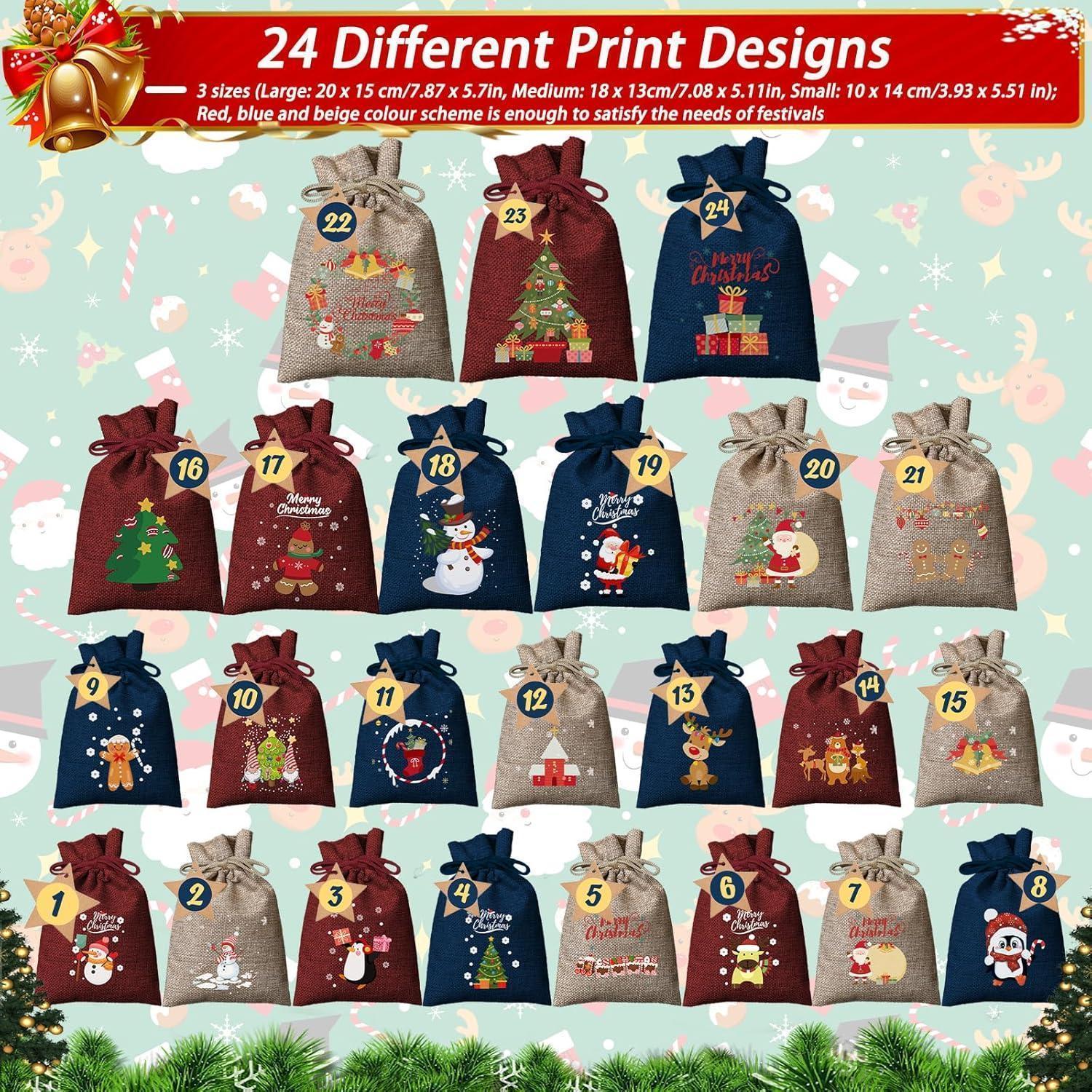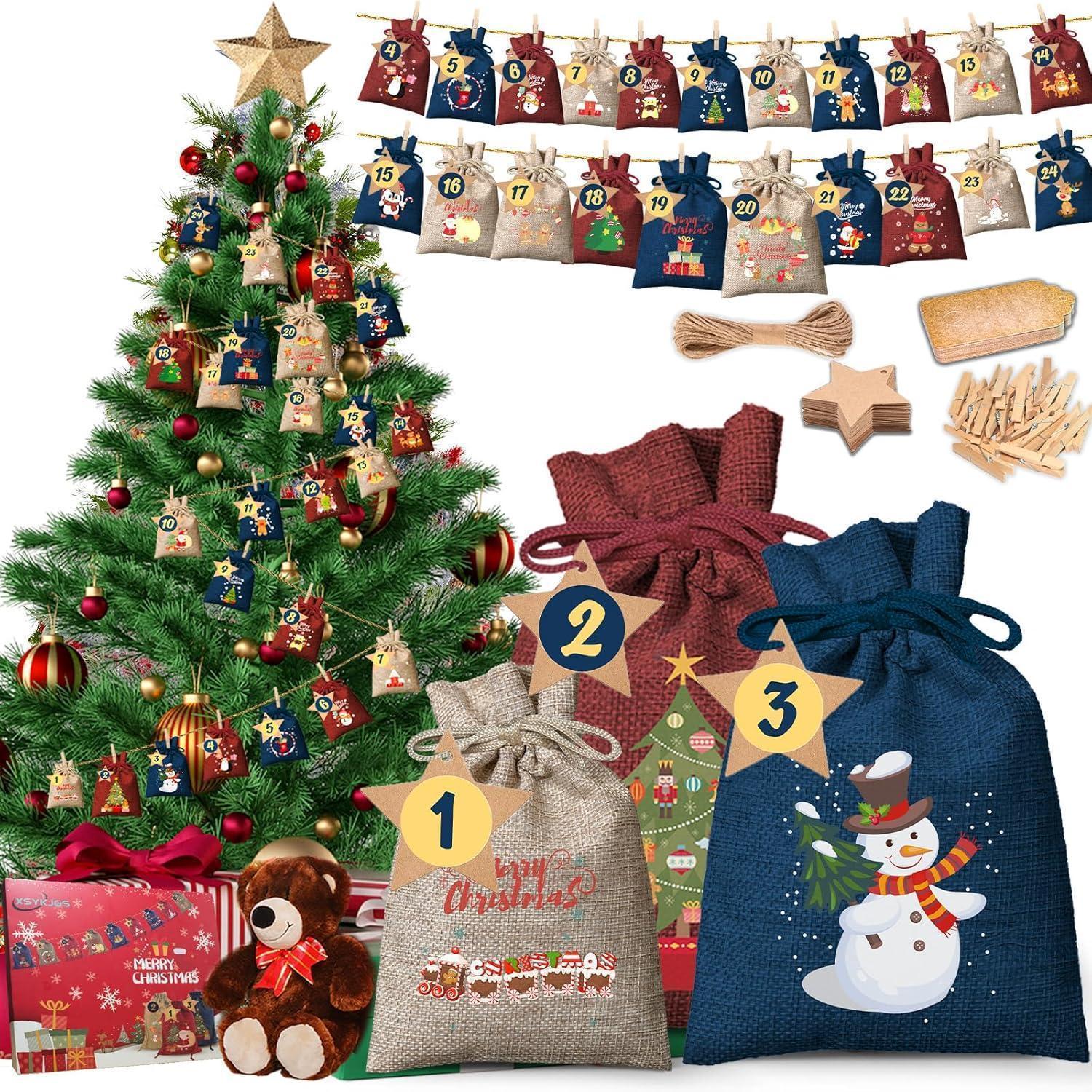 Die adventskalender säckchen zum befüllen zum Befüllen hat eine einzigartige und kreative Verpackung, perfekt für Ihre Weihnachtsdekoration. Adventskalender zum Befüllen kann nicht nur für die Dekoration verwendet werden, sondern auch als eine Möglichkeit, zu interagieren und Überraschungen unter Familienmitgliedern zu teilen. Es ist auch eine tolle Geschenktüte für Hochzeiten, Duschen, Empfänge und andere festliche Anlässe. Jede Adventskalender tüten zum befüllen ist mit einem anderen Muster bedruckt, Sie können die Adventskalendertüte nach Ihren eigenen Vorlieben und Ihrer Kreativität basteln, um ein einzigartiges Weihnachtsgeschenk zu schaffen. Öffnen Sie jeden Tag eine und bringen Sie Ihrer Familie und Ihren Freunden bis Weihnachten ständige Überraschungen! Adventskalender zum befüllen stoff kann mit allen Arten von Geschenken, Süßigkeiten, Keksen, Schokolade, Spielzeug, Segensbriefen oder kleinen Überraschungen zum Befüllen gefüllt werden. Der Adventskalender 2024 wird mit 24 Holzklammern und 10 Metern Schnur geliefert, die an Kaminen, Türen, Weihnachtsbäumen, Fenstern, Wänden, Treppengeländern usw. aufgehängt werden können und Ihrer Familie und Freunden festliche Freude bringen. Der Adventskalender säckchen zum befüllen ist aus hochwertigem natürlichem Sackleinen, bequem und atmungsaktiv, geruchlos, langlebig, nicht leicht zu brechen oder zu verblassen, waschbar und wiederverwendbar, einfach zu lagern. Klassische Weihnachtselemente gedrucktes Design, keine Notwendigkeit, Aufkleber zu verwenden, kann Ihre verschiedenen Bedürfnisse und dekorativen Zwecke in der Ferienzeit erfüllen. Adventskalender zum Befüllen 2024 enthält 24 Weihnachtsgeschenktüten, 24 Pentagramm-Etiketten, 24 rechteckige-Etiketten, 1-24 zweifarbige Zahlenaufkleber, niedlich und zart. 3 Größen (max: 20 x 15 cm/7.87 x 5.7 in, min: 10 x 14 cm/3.93 x 5.51 in); rot, blau und beige Farbschema, ausreichende Menge, um die Die Nachfrage nach Festen.