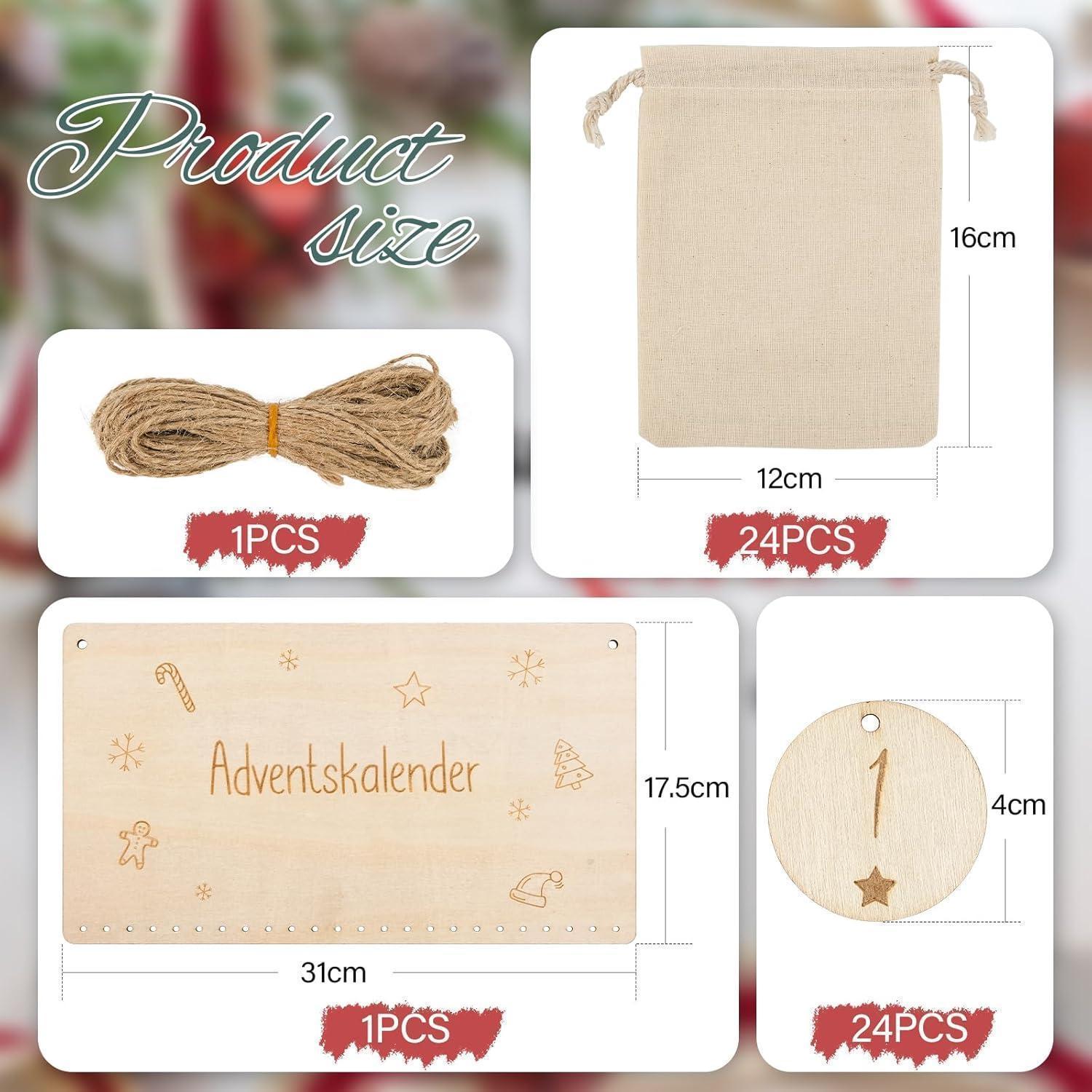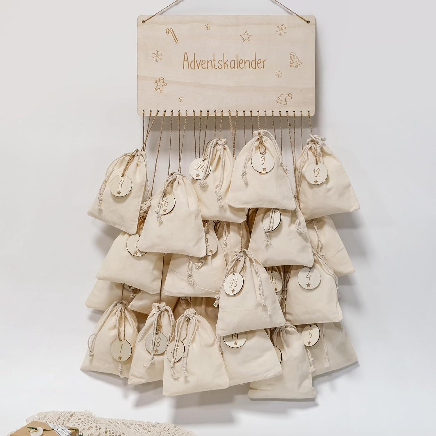 Adventskalender zum Befüllen 24 Baumwolltasche 16 x 12 cm Beige Stoffbeutel Kinder Weihnachtskalender zum Selber Befüllen Inkl 24x rundes Holzschild +31x17.5 cm 1Großes Holzschild