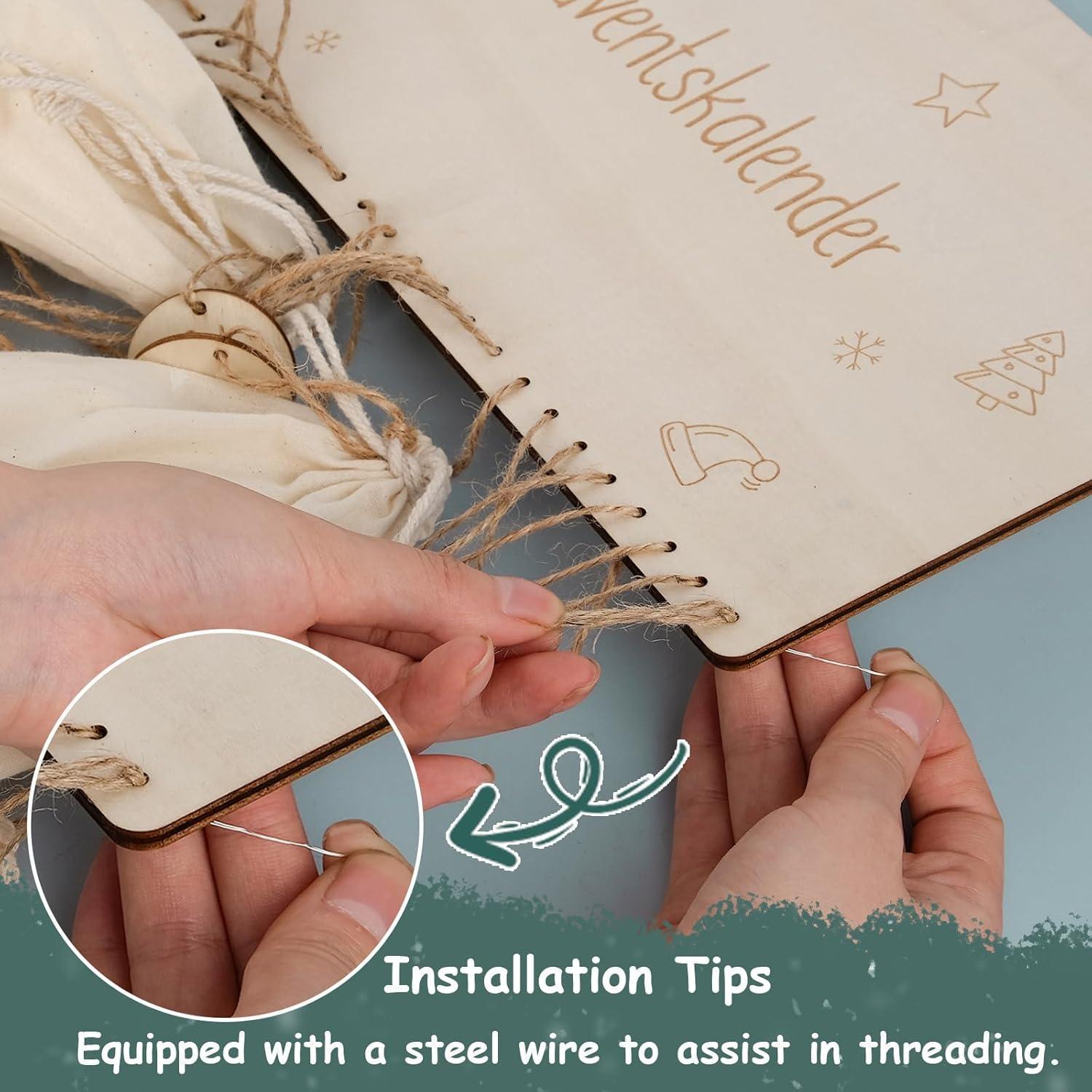 ???? [NIEDLICHE WEIHNACHTSDEKO] - Der Adventskalender 2024 aus sehr stabilem FSC-Holz ist nicht nur praktisch, sondern auch eine schöne Dekoration für Weihnachten. Umweltfreundlich und wiederverwendbar. Im Lieferumfang ist ein dünner Stahldraht enthalten, der das Einfädeln erleichtert und die Installation vereinfacht.