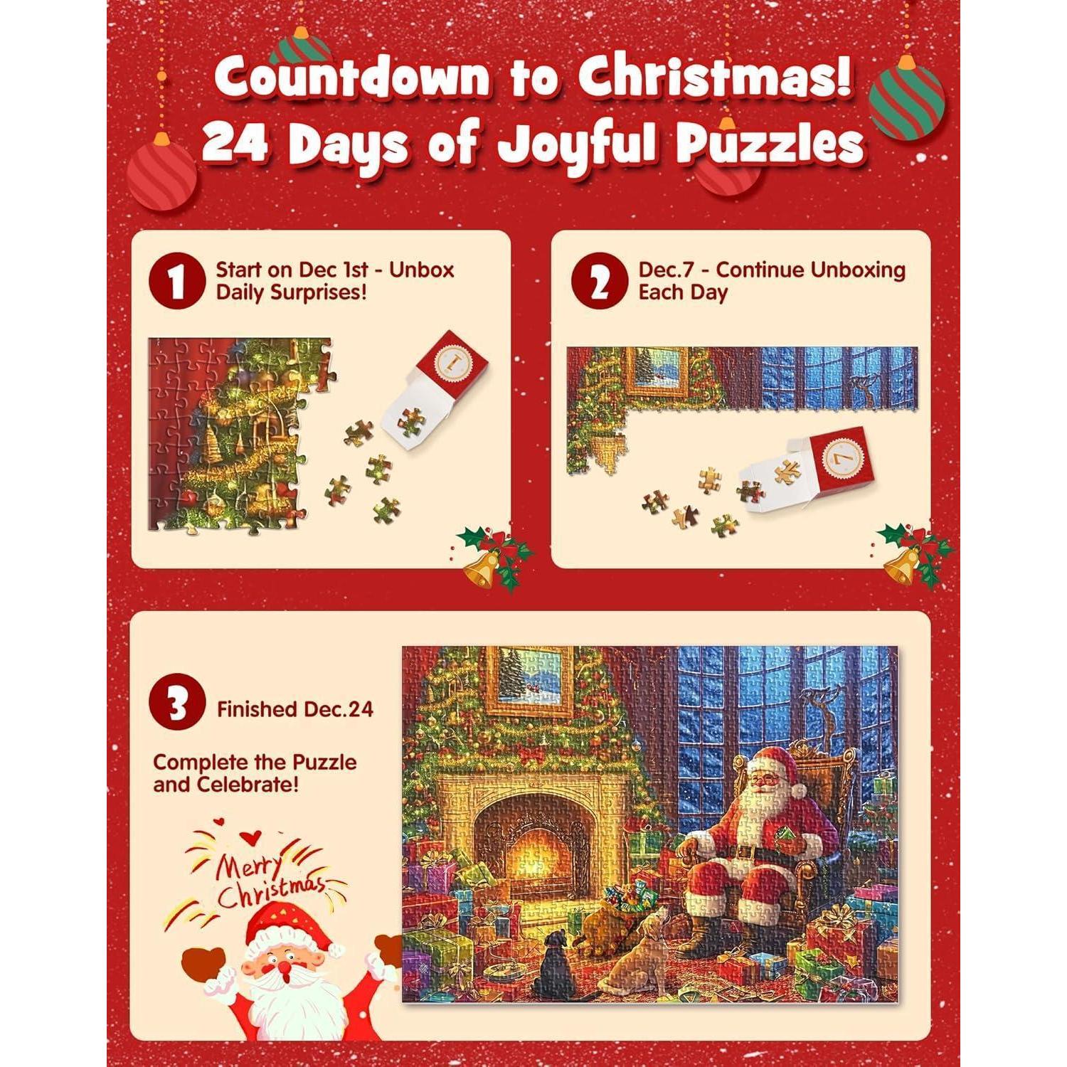 Weihnachts-Countdown-Puzzle: Dieser Weihnachts-Countdown-Puzzlekalender enthält 24 Kästchen mit 1008 Puzzleteilen. Vervollständigen Sie jeden Tag ein Teil des Puzzles und enthüllen Sie nach 24 Tagen eine festliche Weihnachtsmann-Szene, die den Geist der Weihnacht perfekt einfängt. Eine wunderbare Art, den Countdown bis Weihnachten mit Familie und Freunden zu feiern.