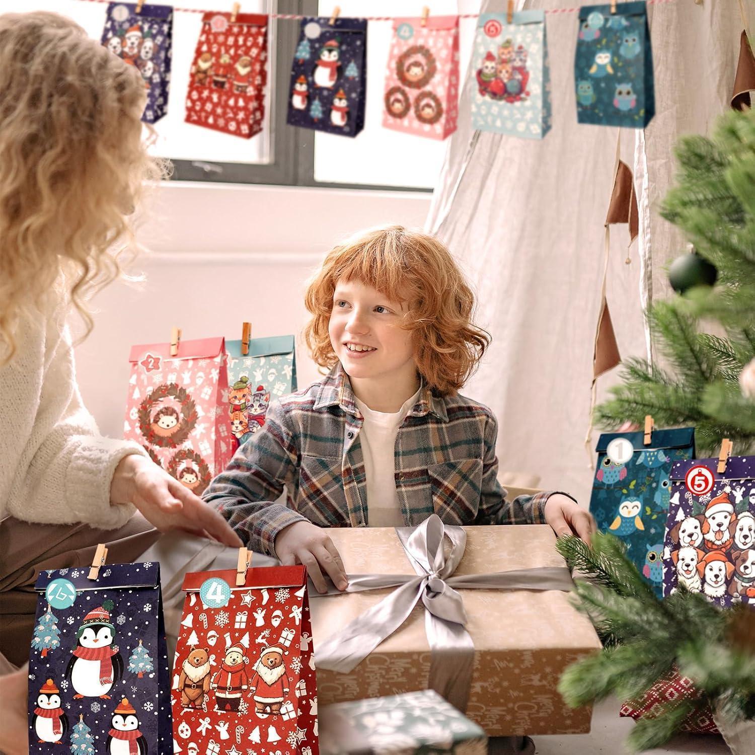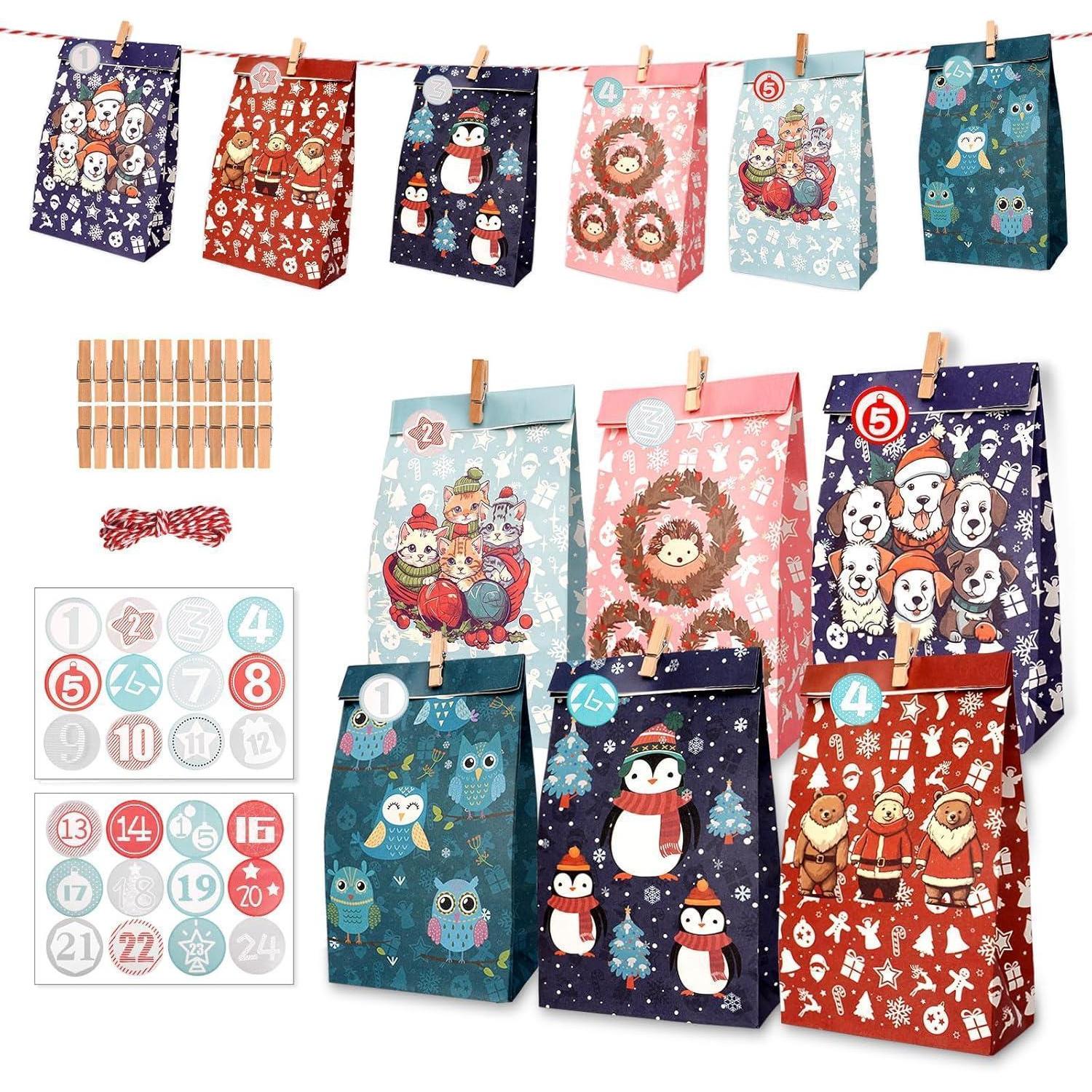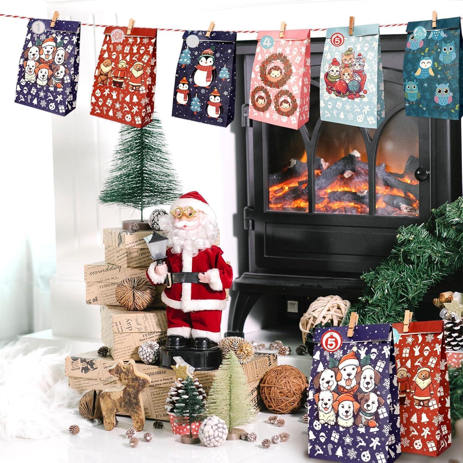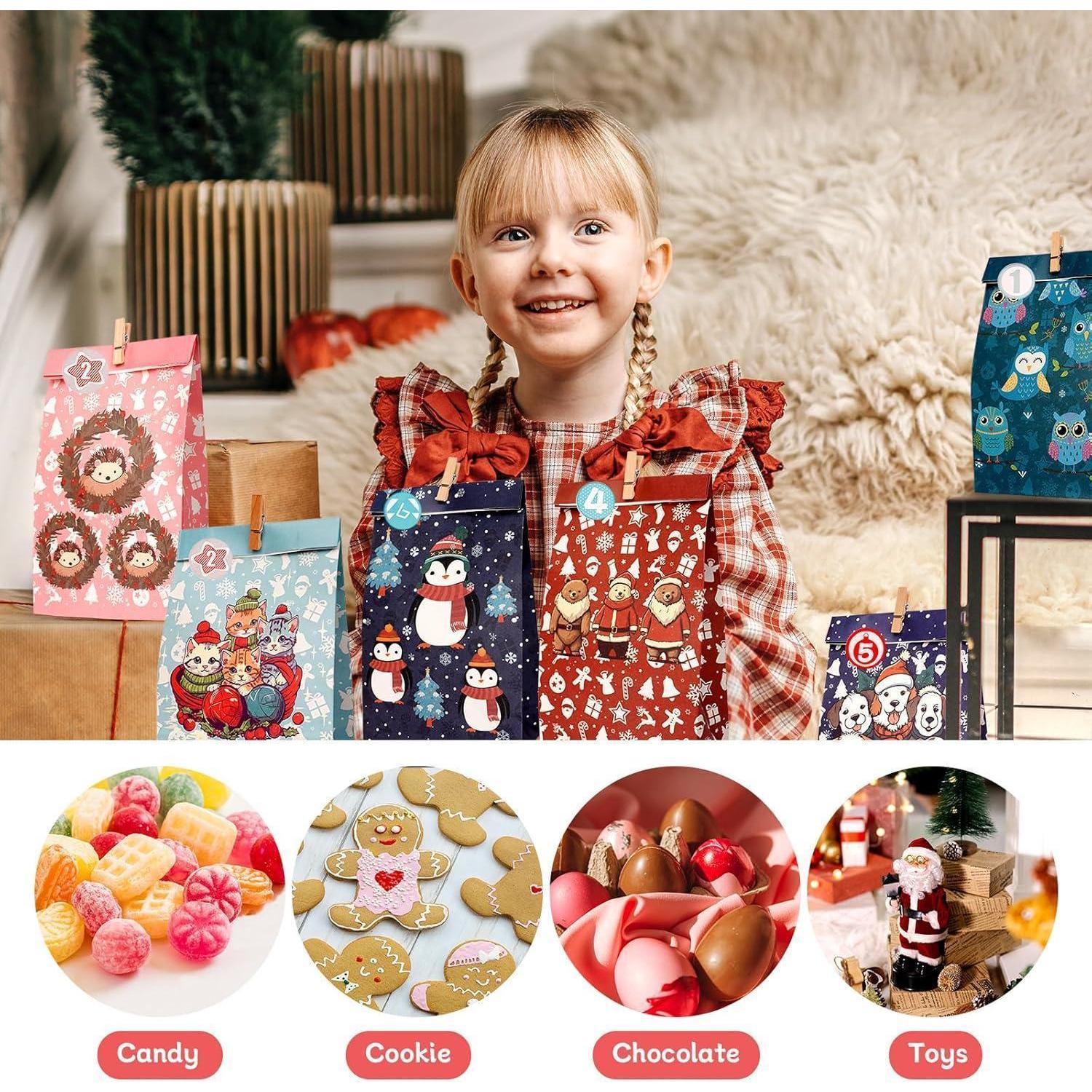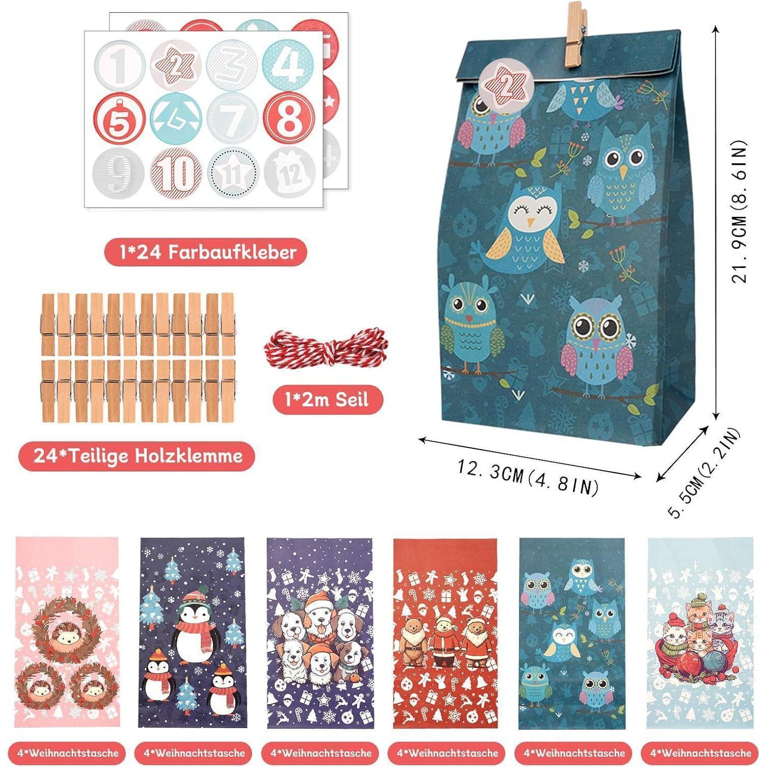 Machen Sie Ihren eigenen Adventskalender - Anstatt einen typischen Adventskalender mit Schokolade hinter jeder Tür zu verschenken, probieren Sie diese neuartige DIY-Geschenktüte aus. Verwenden Sie diese schönen Papiertüten, Aufkleber und Karten, um Ihre eigenen Adventskalendertaschen zu machen. Alle Bilder auf den Papiertüten des Adventskalenders wurden ursprünglich von unserer Marke entworfen und beinhalten weihnachtliche Elemente wie Schnee, Weihnachtsbaum, Hirsch, Schlitten und Schneemann. Die Geschenktüten bestehen aus hochwertigem weißem Kraftpapier und sind mit ungiftigem Pigment bedruckt, um die Sicherheit zu gewährleisten.