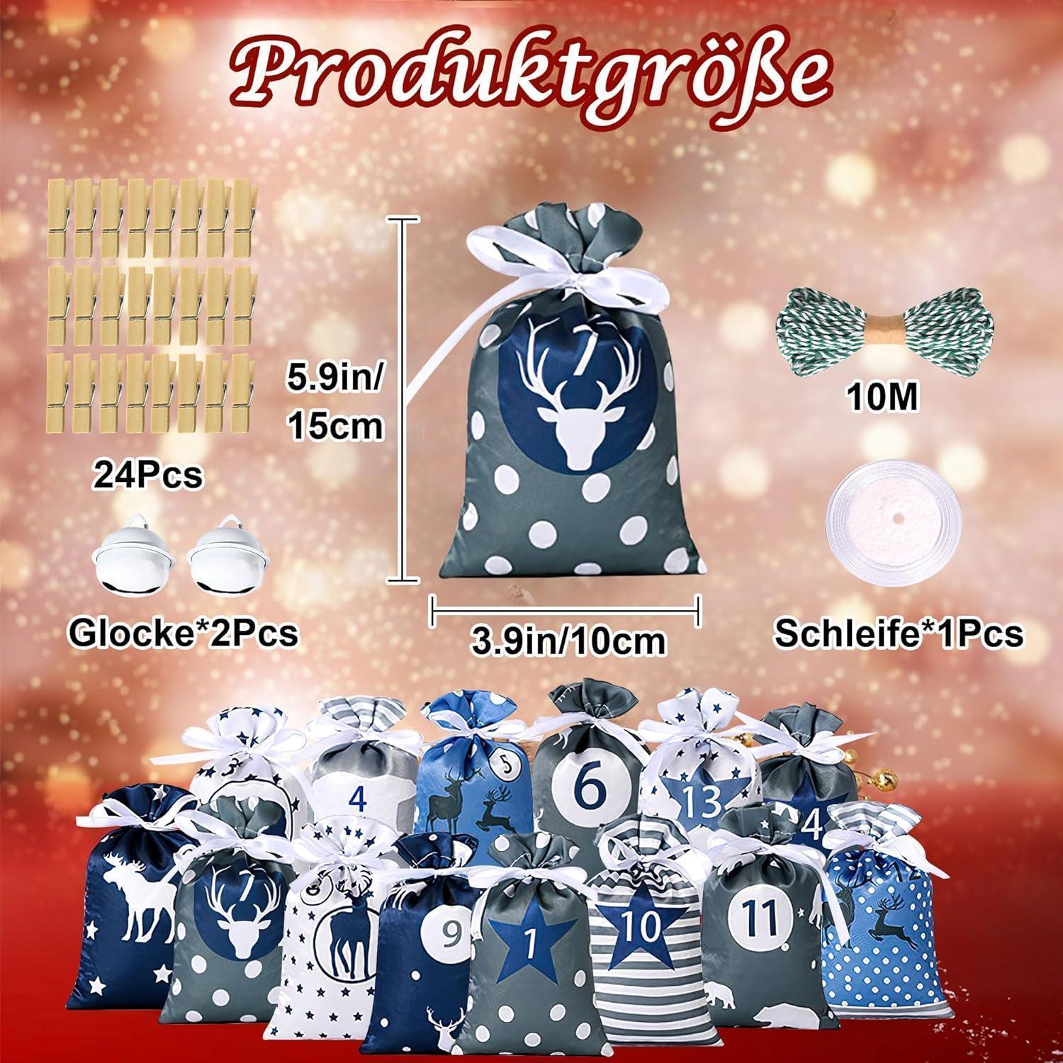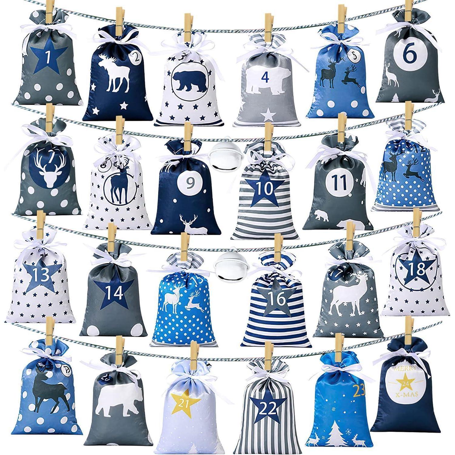 Interessantes Design - Das Set umfasst 24 blickdichte Stoffsäckchen in den Farben Weiß, Grau und Blau. Mit Hirsch, Weihnachtsbaum und Sternen bedruckt, perfekt für weihnachtliche Stimmung.