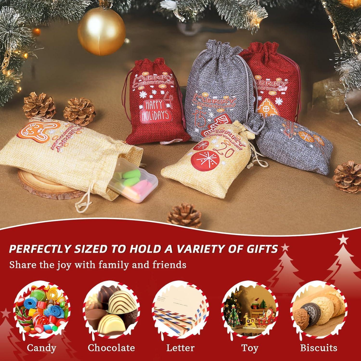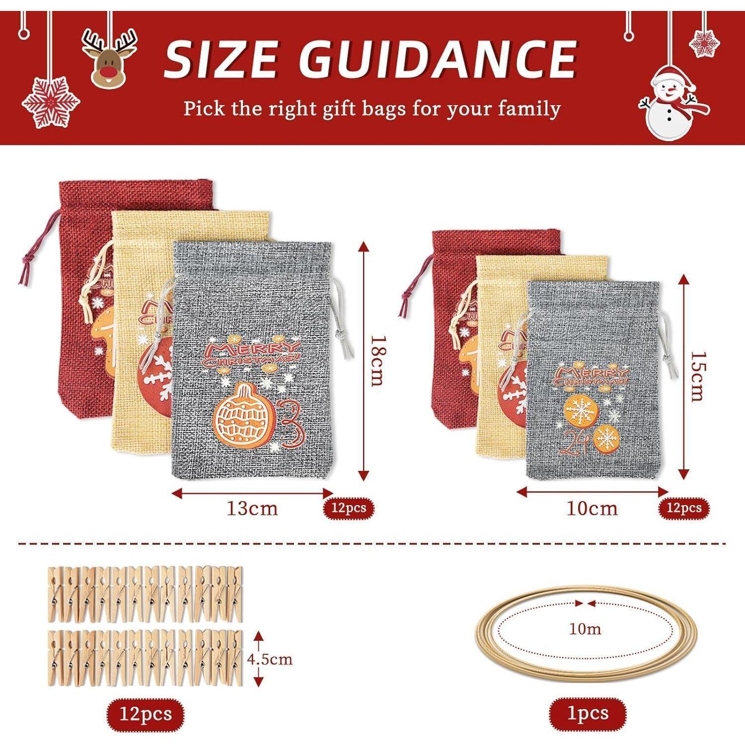 24 Adventskalender-Säckchen: Unsere Adventskalender zum Befüllen Kinder bieten zwei verschiedene Größen (10 x 15 cm / 13 x 18 cm), jeweils 12 Stück pro Größe. Sie eignen sich sowohl für kleinere als auch für größere Geschenke und erfüllen Ihre unterschiedlichen Geschenkbedürfnisse, wie zum Beispiel: Süßigkeiten, Kosmetika, Spielzeug, Pralinen, Schmuck oder andere kleine Geschenke.