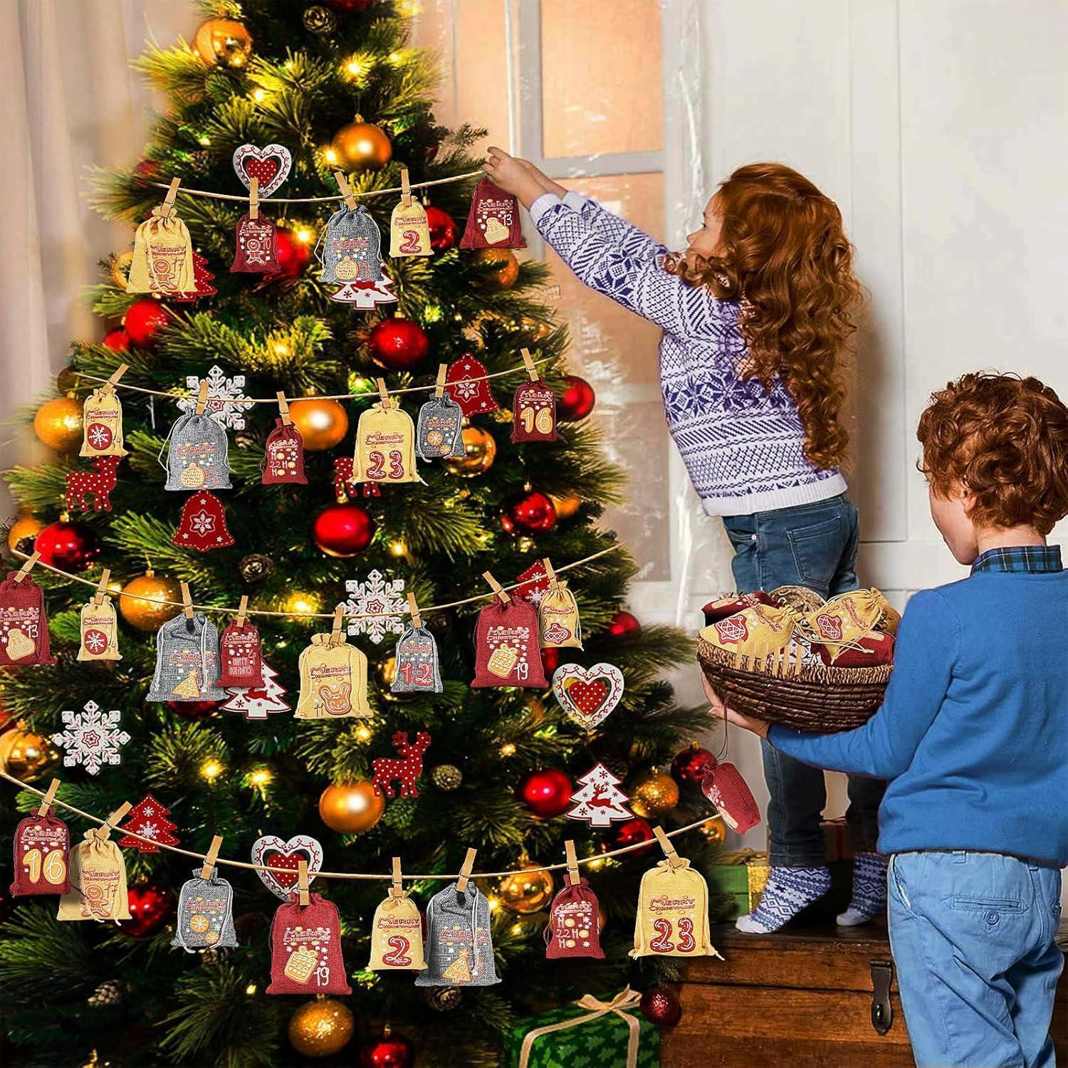 Weihnachtskalender – Dekorieren Sie Ihr Weihnachten: Unsere Adventskalender-Säckchen werden mit 24 Holzklammern und einer 10 Meter langen Schnur geliefert. Sie können die Schnur an den Weihnachtsbaum, den Kamin, einen Zweig, die Treppe, das Fenster oder die Wand binden und an verschiedenen Orten aufhängen, um eine festliche Weihnachtsatmosphäre zu schaffen. Zudem lassen sie sich schön mit Gegenständen wie Zweigen und Kugeln dekorieren.