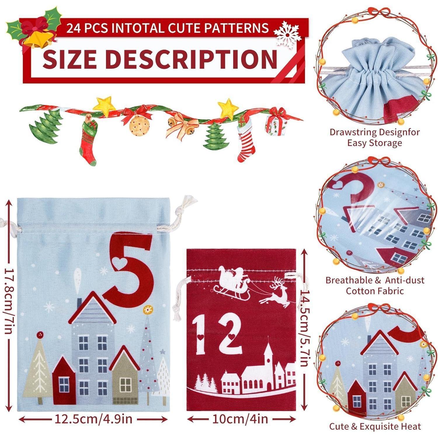 Der Adventskalender zum Befüllen bietet eine kreative und festliche Möglichkeit, die Vorfreude auf Weihnachten zu steigern. Mit 24 Stoffbeuteln in 2 verschiedenen Größen (12 große 13cm x 18cm und 12 kleine 10cm x 14cm) ist dieser Adventskalender perfekt, um kleine Überraschungen für Ihre Liebsten zu verpacken.
