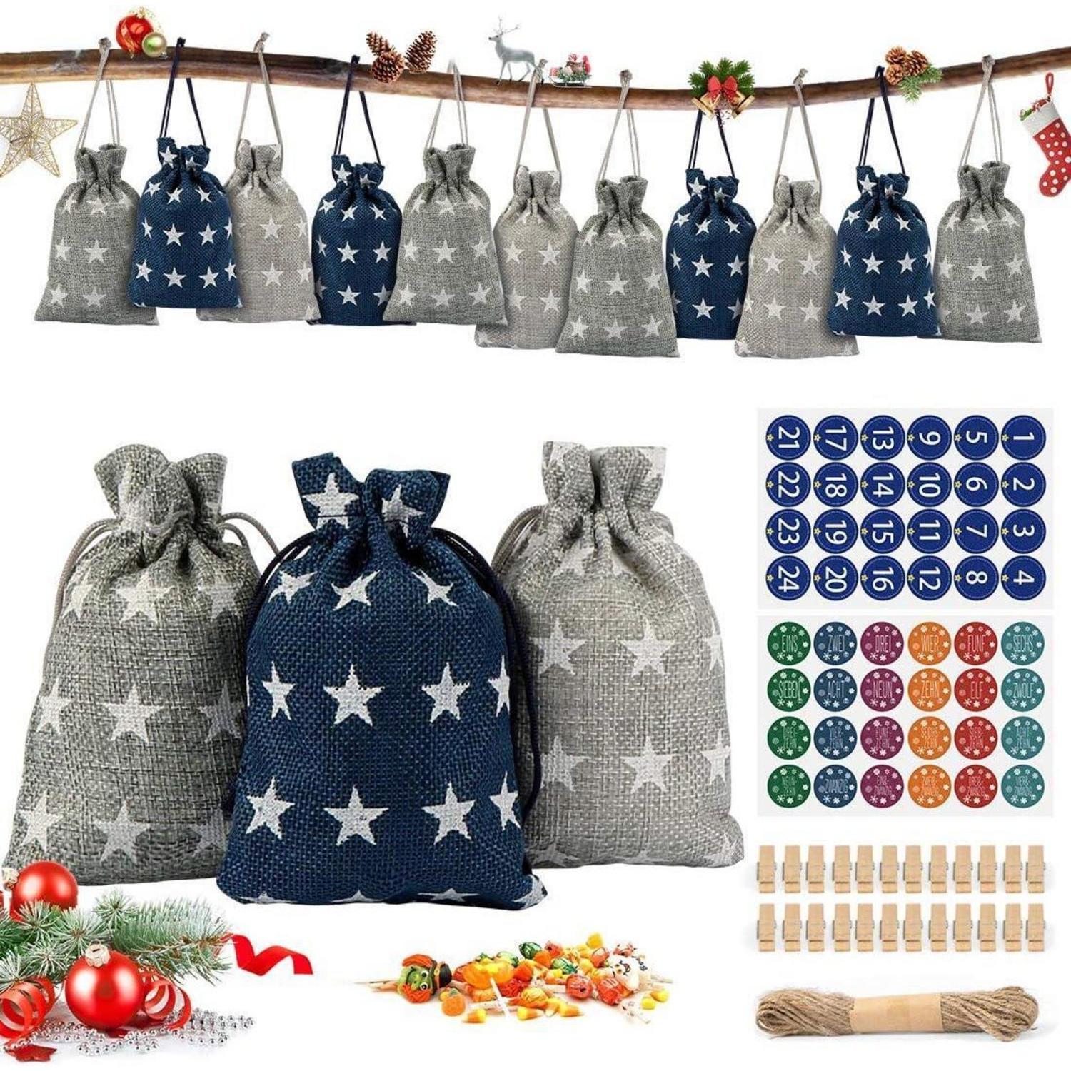 ???? Adventskalender zum Befüllen: Das bunte Design mit fünfzackigen Sternen in Blau, Dunkelgrau und Hellgrau macht diesen Adventskalender zu einem echten Hingucker. Enthalten sind 24 Stück, 24 Aufkleber mit den Zahlen, 24 Holzklammern und 10m Hanfseil, damit Sie gleich loslegen können.