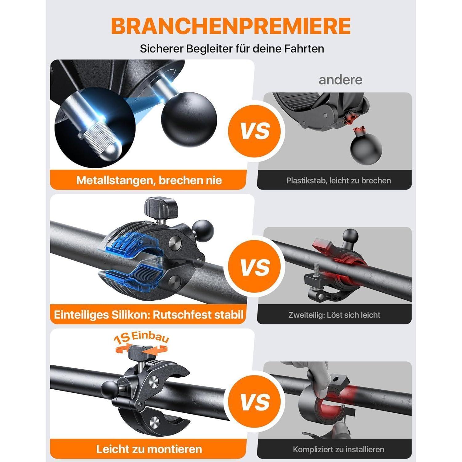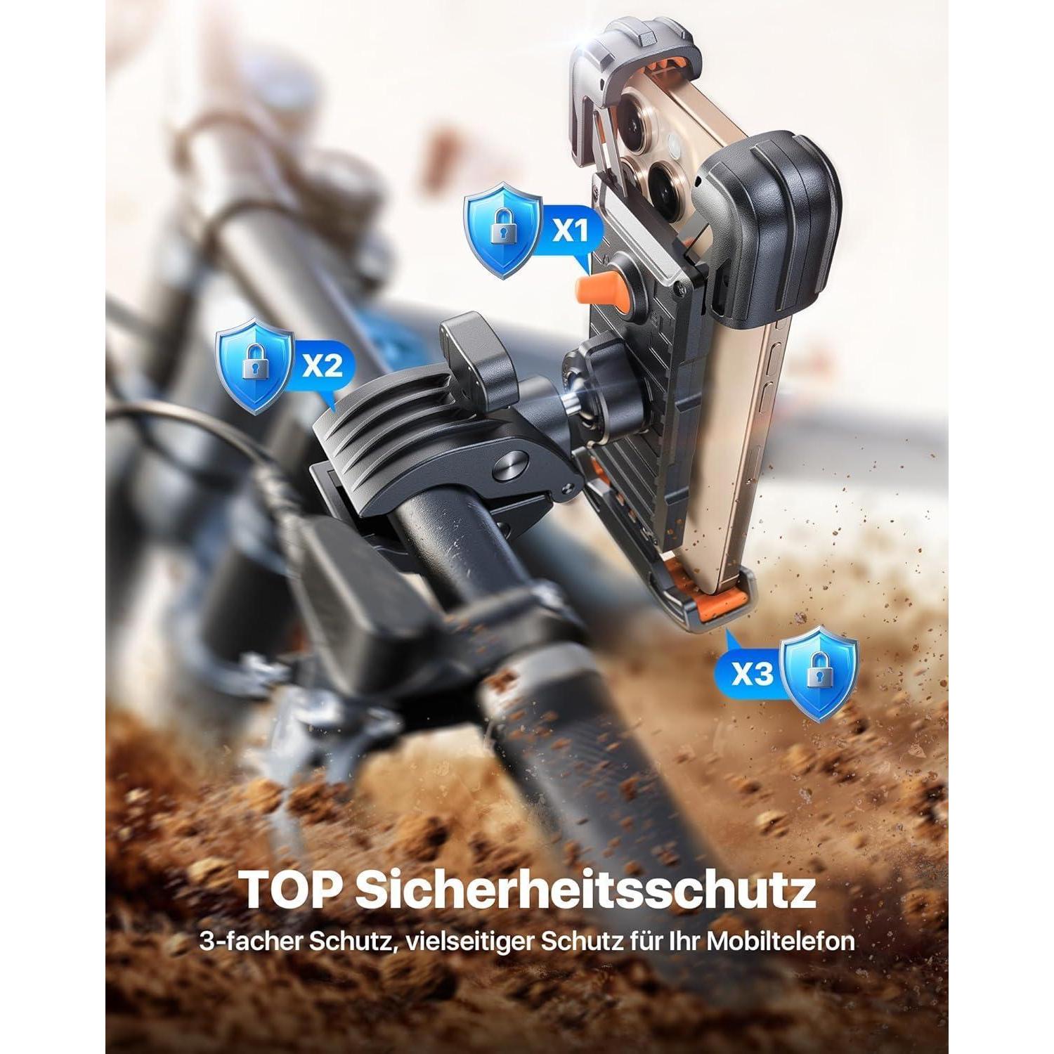 Die Halterung verfügt über eine einzigartige Metallzange mit einer präzisen Befestigungsstruktur aus Stahl, die für maximale Stabilität sorgt. Mit Anti-Rutsch-Pads der Klasse A+ und einem festen Verschlussmechanismus bleibt Ihr Telefon sicher und geschützt, egal auf welchem Terrain Sie unterwegs sind.