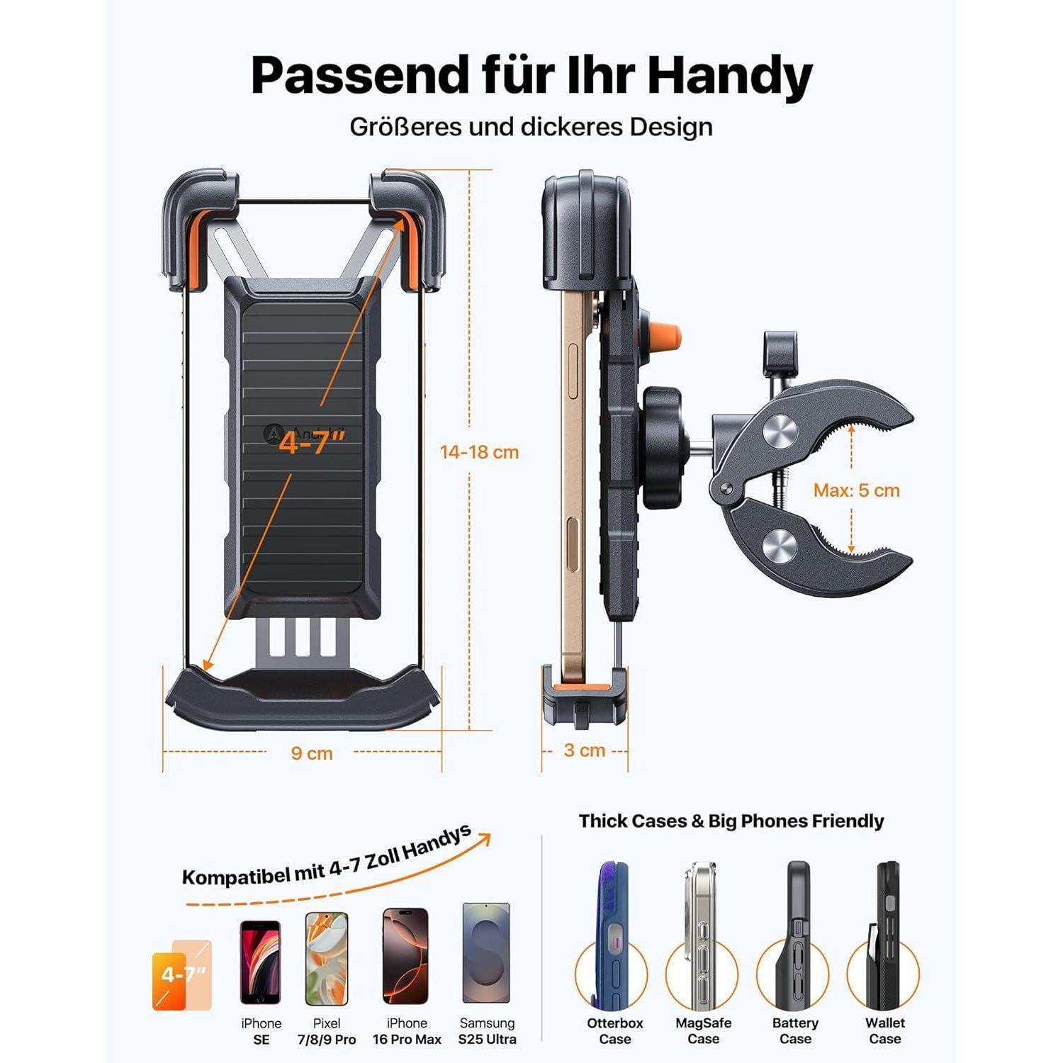 Breitere Kompatibilität: Passt zu einer Vielzahl von Handymodellen und Lenkergrößen für vielseitige Anwendungsmöglichkeiten.