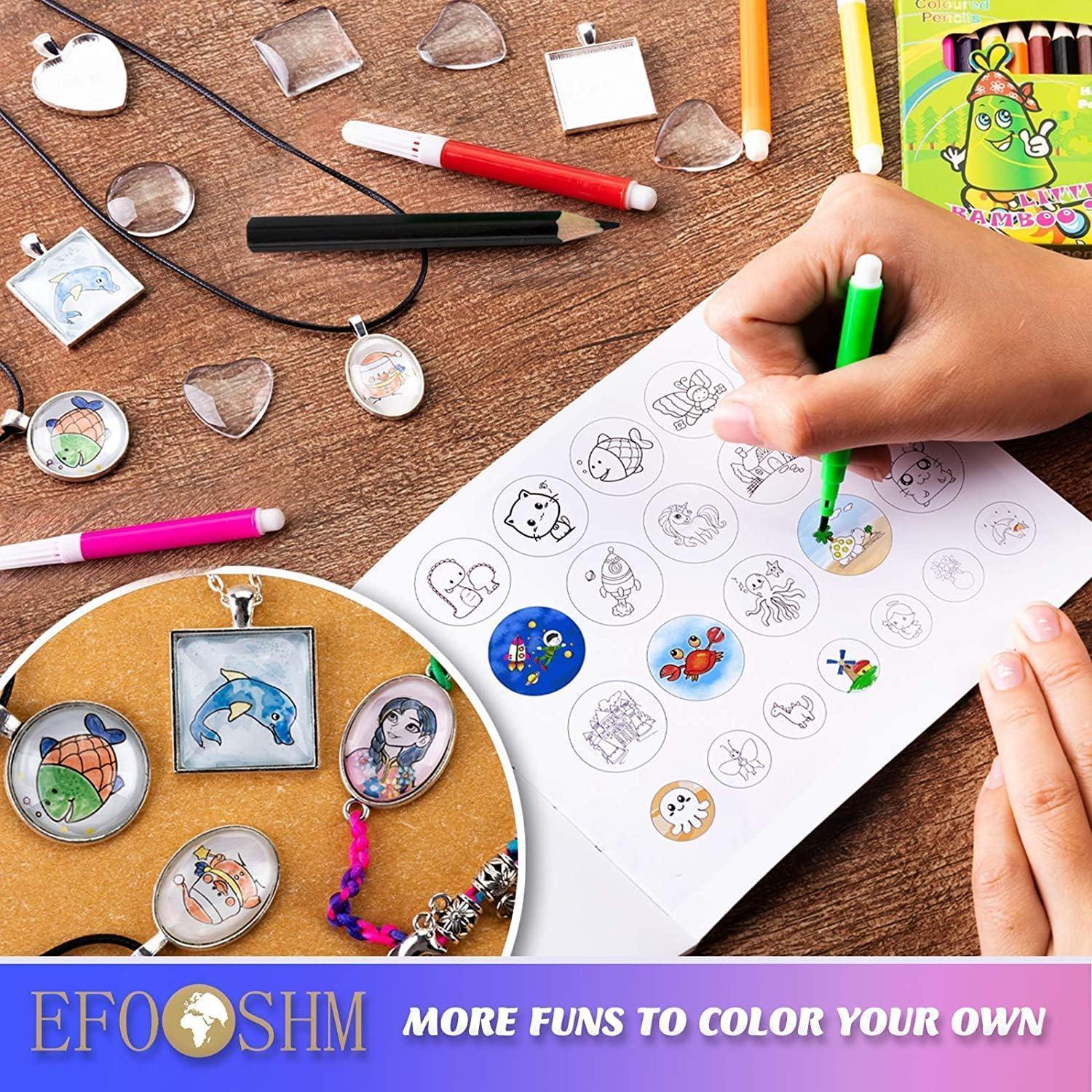 Die 90 wunderschönen Bilder in verschiedenen Formen wie Herz, Oval, Rund und Quadrat sind perfekt, um Ihre Lieblingsfotos in handgefertigten Schmuckstücken zu verewigen. Mit den 18 Buntstiften können Sie die Bilder nach Belieben ausmalen und so ein ganz persönliches Schmuckset kreieren.