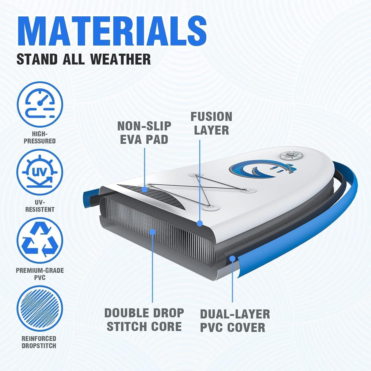 Dank des mitgelieferten Zubehörs wie Pumpe, Sicherheitsleine, drei Flossen, Rucksack und einem längenverstellbaren Aluminiumpaddel sind Sie bestens ausgestattet. Das Board zeichnet sich durch sein stabiles und leichtes Design aus, das eine maximale Traglast von bis zu 350 lbs bietet.