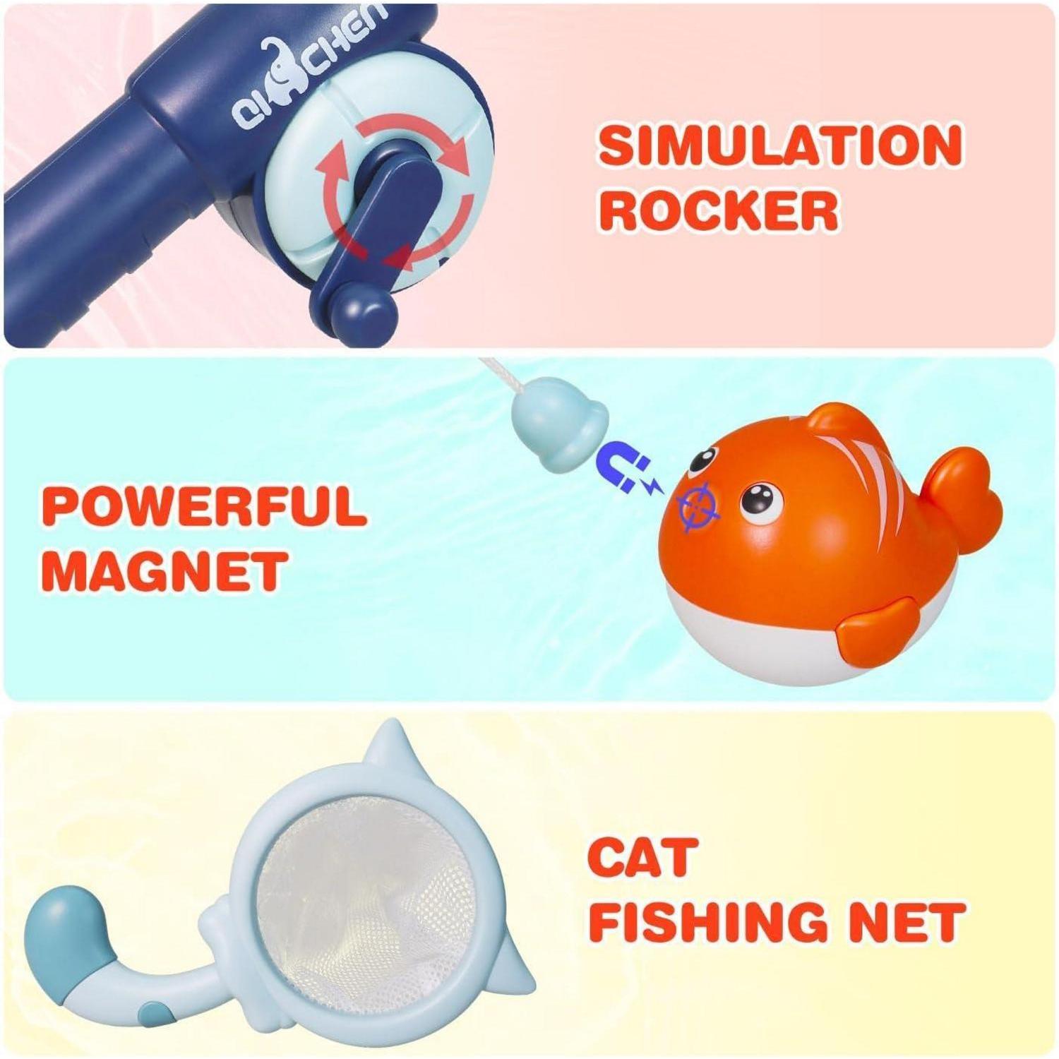 Die Meerestiere und die Angelstäbe sind mit Magneten ausgestattet, was das Angeln zu einem lustigen Erlebnis macht. Kinder können die niedlichen Meeresbewohner nicht nur mit den Angelstäben, sondern auch mit dem Fischernetz aus dem Badewasser fischen.