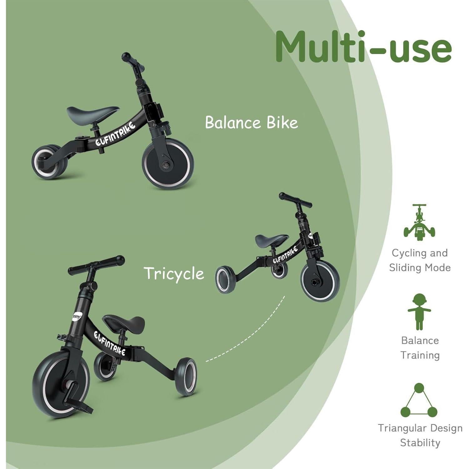 Das 5-in-1 Design ermöglicht vielseitige Nutzungsmöglichkeiten von 1 bis 4 Jahren. Mit drei verschiedenen Modi - Dreirad-Modus (großer/kleiner Winkel), Slip-Modus und Lauflernrad-Modus (großer/kleiner Winkel) - kann das Kinderfahrrad an die Bedürfnisse Ihres Kindes angepasst werden. Ein-Klick für die Deformation erleichtert zudem die Handhabung.
