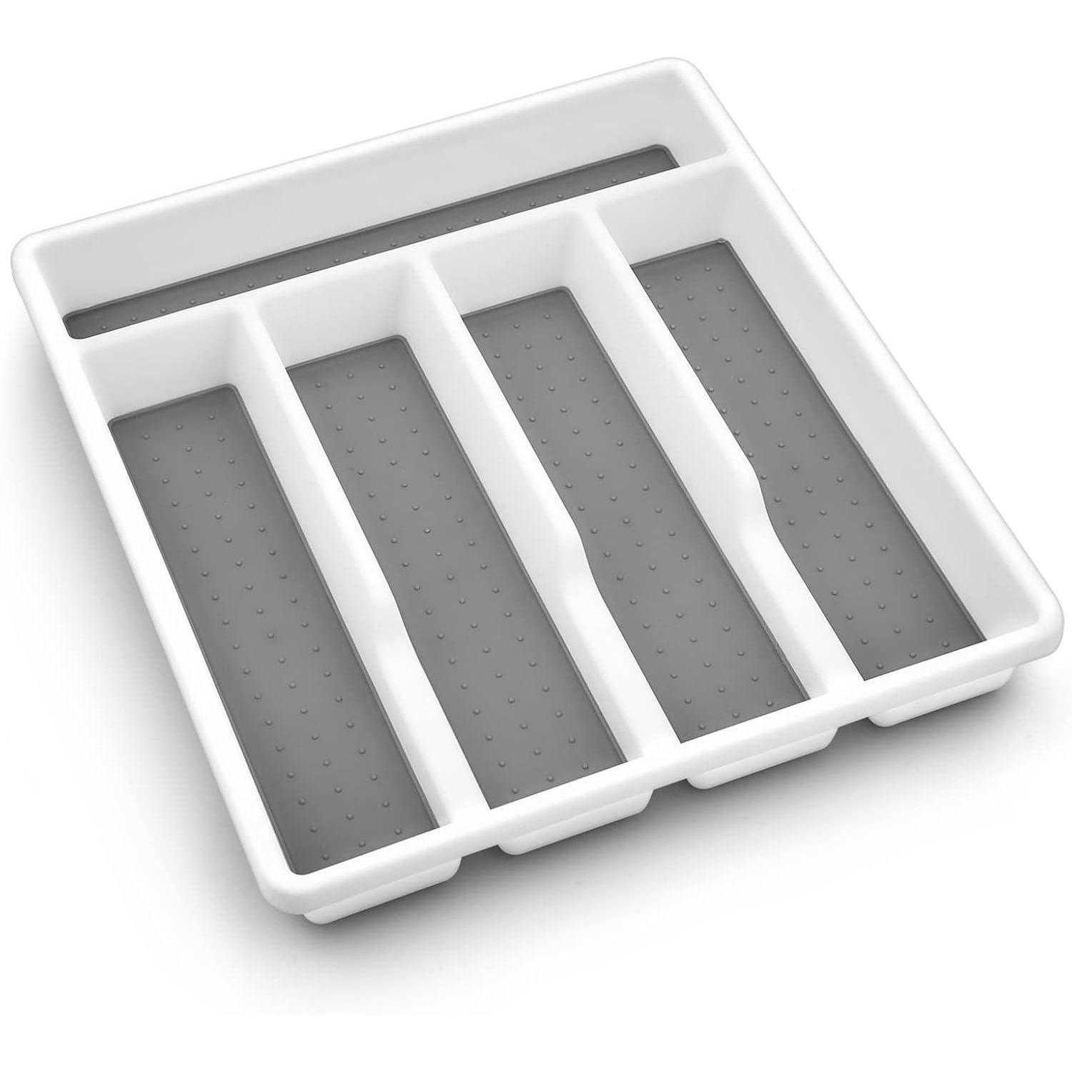 Das moderne Design mit abgerundeten Ecken macht den Besteckkasten nicht nur leicht zu reinigen, sondern auch ästhetisch ansprechend. In den Farben Weiß und Grau passt er perfekt in die meisten Schubladen und sorgt für Ordnung und Übersichtlichkeit.