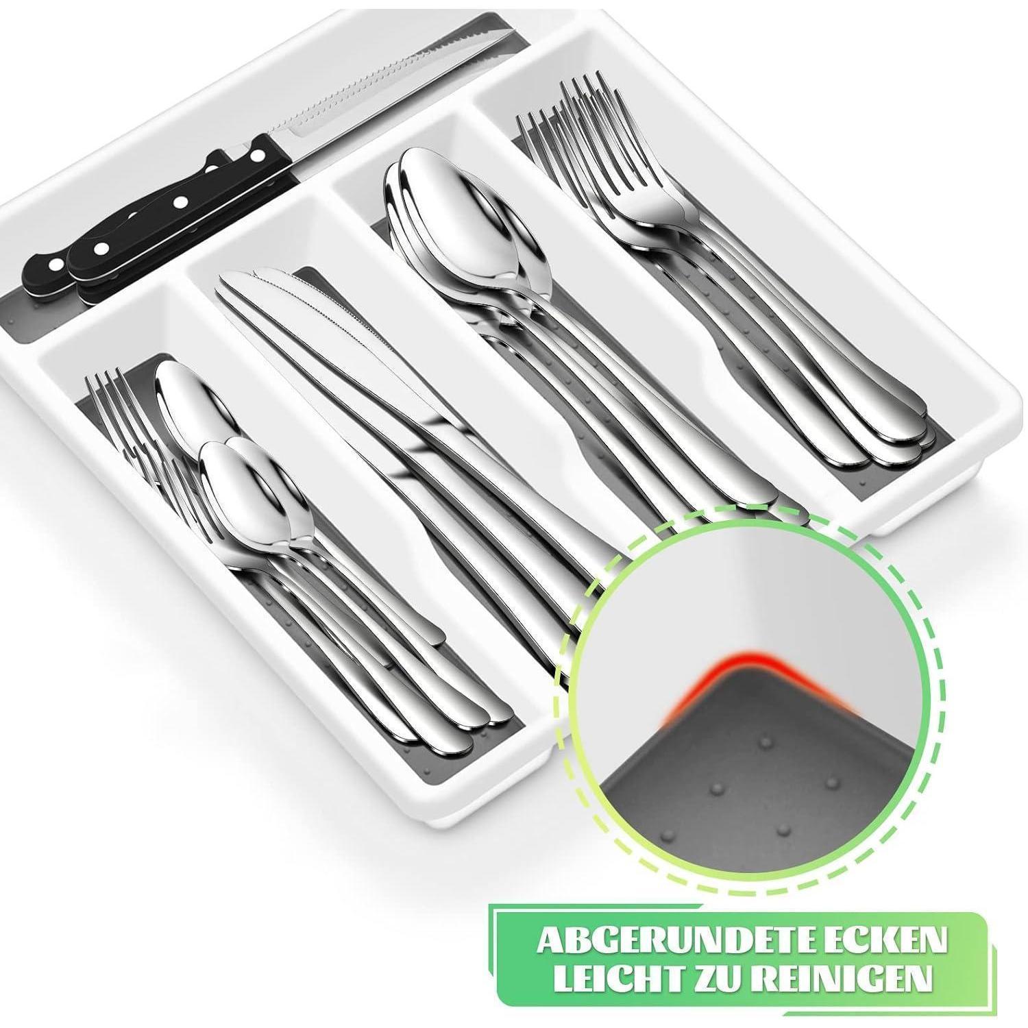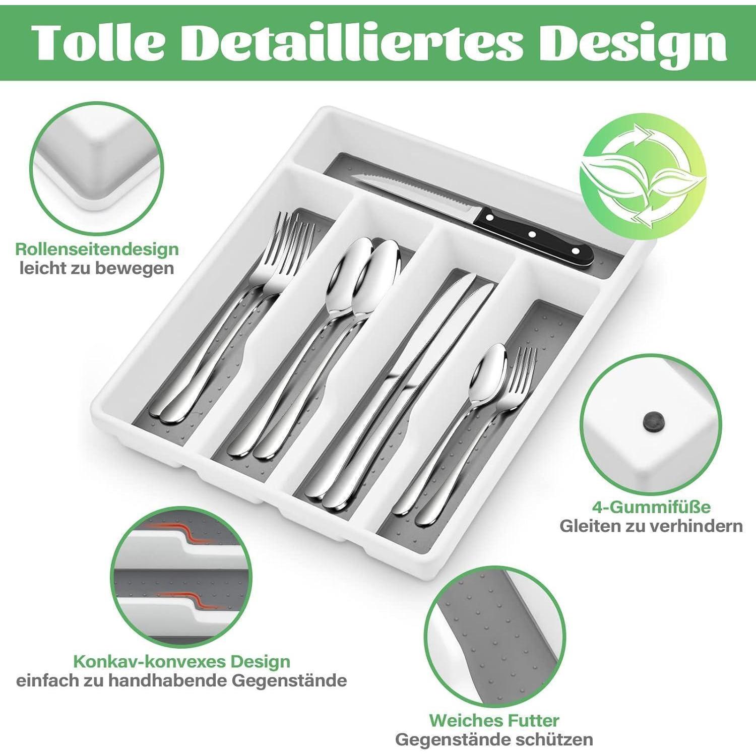 Jeder Fach ist mit rutschfestem Gummi versehen, um ein Verrutschen des Bestecks zu verhindern und lästige Geräusche beim Öffnen der Schublade zu vermeiden. Die Gummifüße an der Unterseite des Besteckkastens sorgen dafür, dass er sicher in der Schublade bleibt und keine Kratzer hinterlässt.