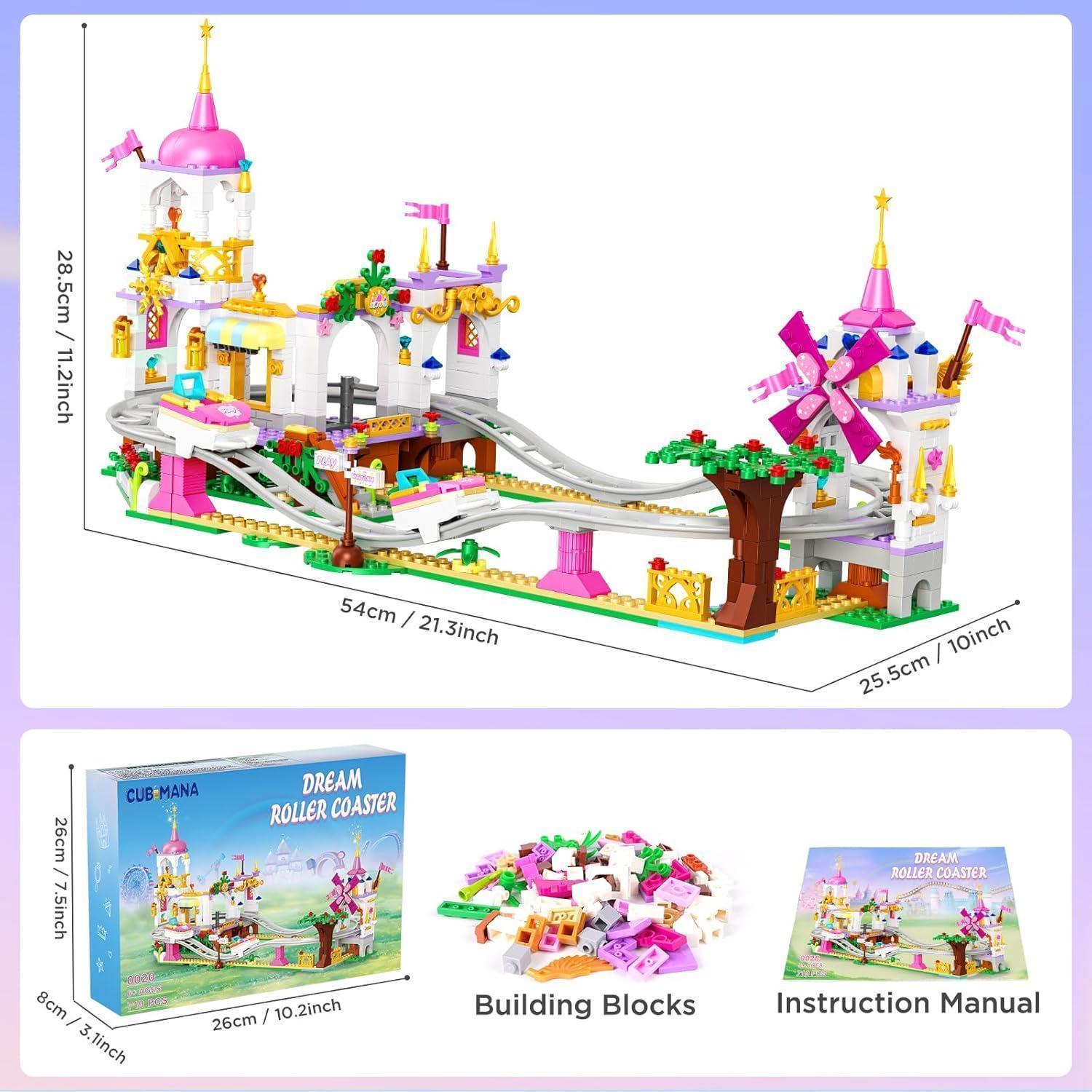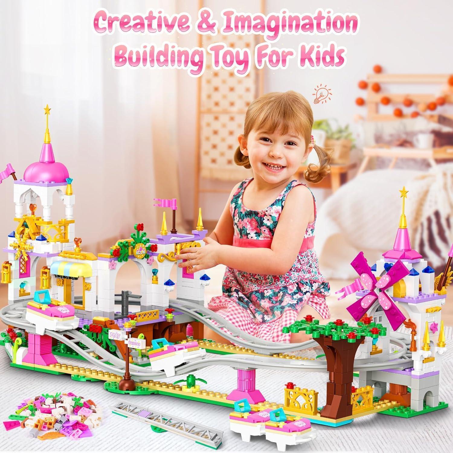 EXQUISITER ACHTERBAHN-BAUKASTEN: Bauen Sie ein lebensechtes rosa Achterbahn-Set, das eine große Vergnügungspark-Achterbahn, Doppelwagen-Achterbahnen, eine Windmühle, eine Ticket-Station, ein Schild und ein rosa Prinzessinnen-Themenschloss enthält! Mit diesem Prinzessin-Karneval-Bausatz können Kinder ihrer Kreativität und Fantasie freien Lauf lassen, wenn sie ihre eigene Achterbahn bauen und die Strecke hinuntergleiten, um ein unvergessliches Erlebnis zu haben.