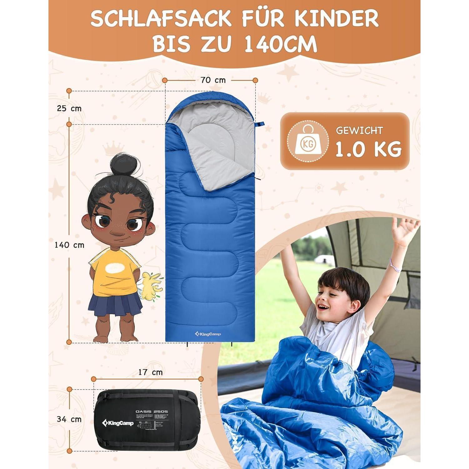 Der Schlafsack kann komplett geöffnet und zu einer großzügigen Decke umfunktioniert werden, was vielseitige Einsatzmöglichkeiten ermöglicht. Zwei Schlaufen am unteren Ende erleichtern das Aufhängen des Schlafsacks, während das leichte Gewicht von nur 1 kg und das kompakte Packmaß von 34 × 17 × 17 cm den Transport erleichtern.