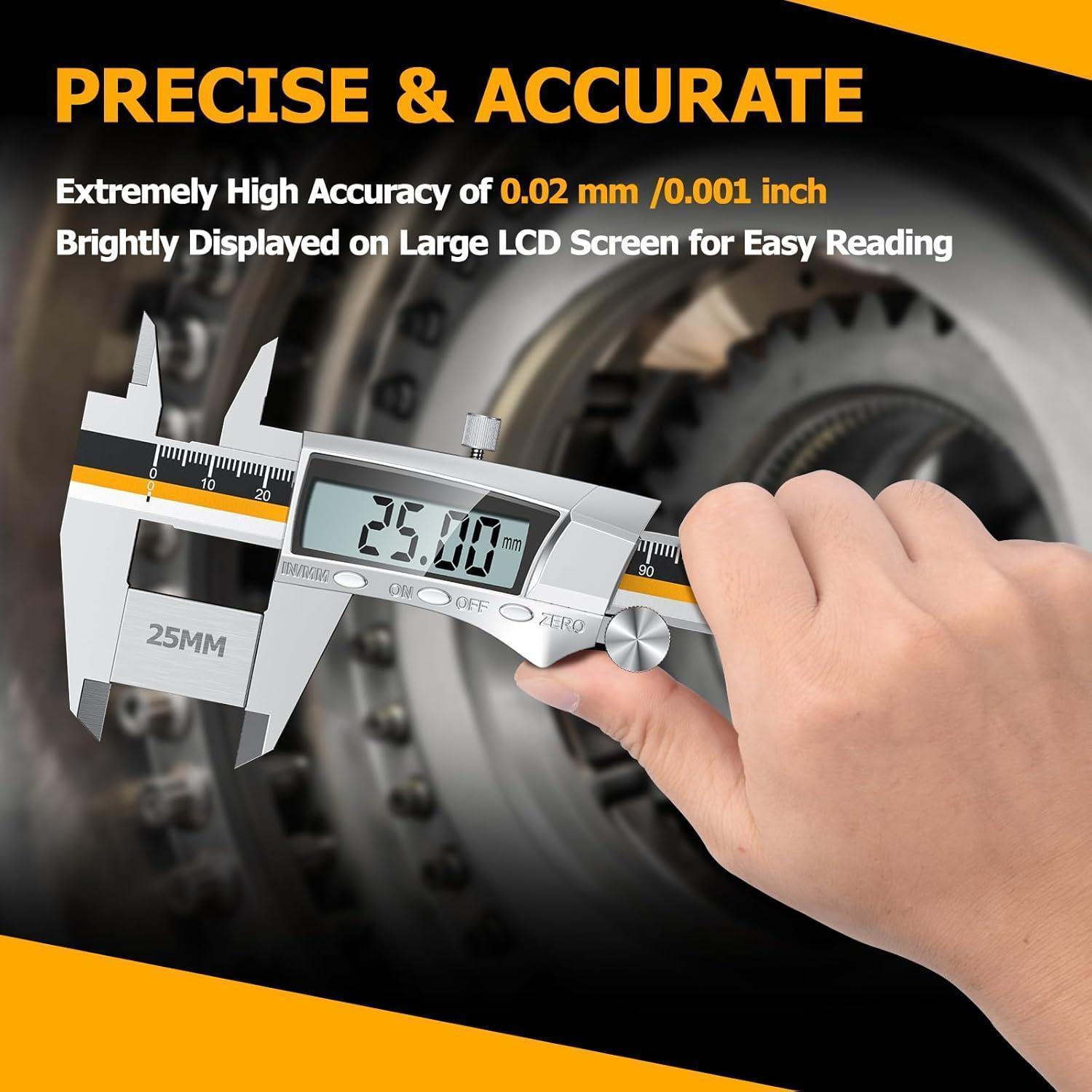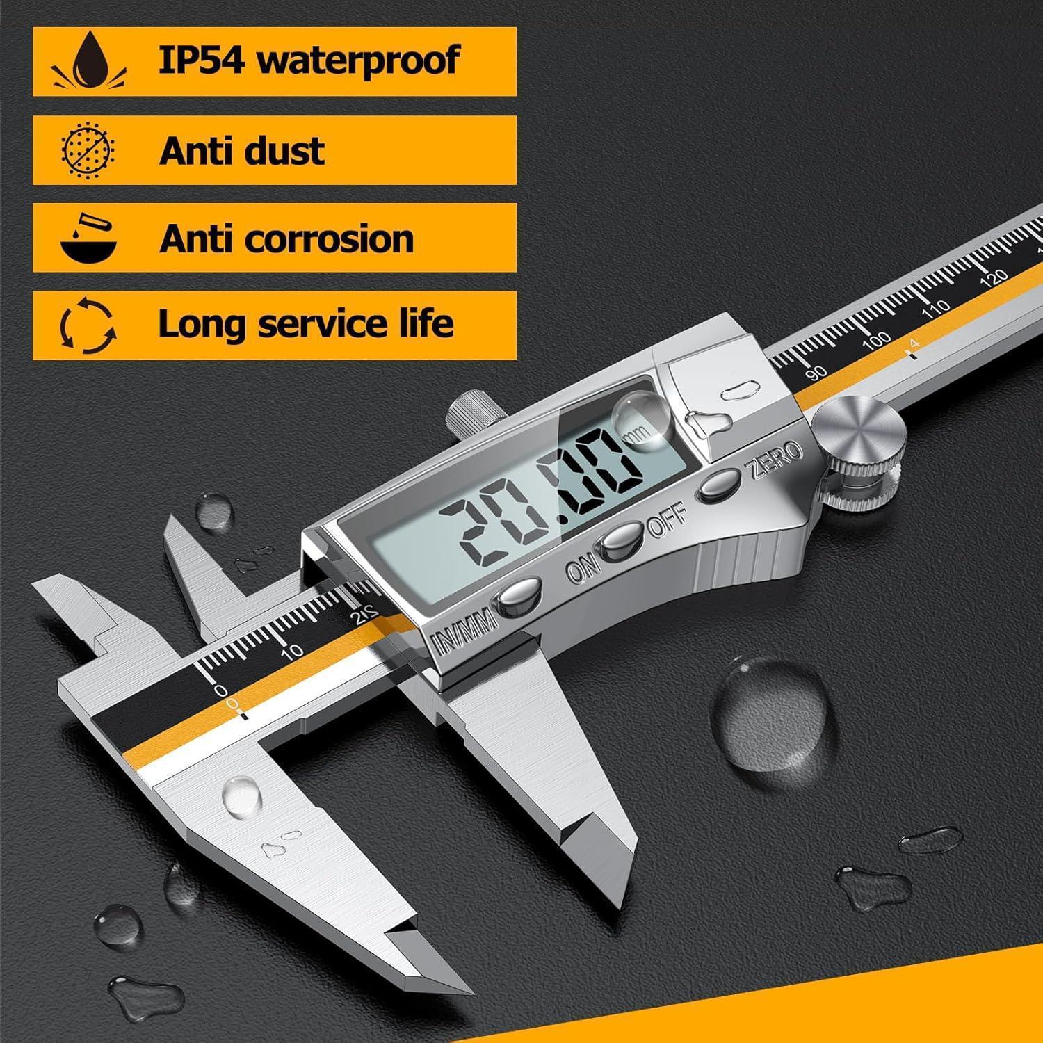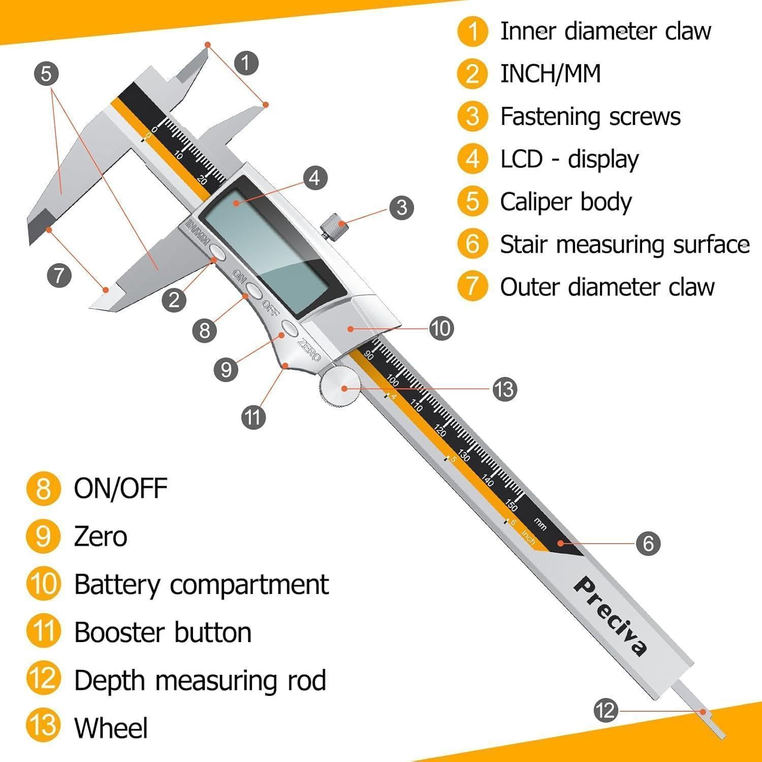 Ausgezeichnete und hochwertige Konstruktion: Die digitalen Messschieber sind aus hochwertigem, gehärtetem Edelstahl gefertigt, der rostfrei und unempfindlich gegen Staub und Wasserspritzer aus allen Richtungen ist. Preciva 150mm Digitaler Messschieber mit größerem Display aus Edelstahl für Innen-, Außen-, Tiefen- und Stufenmessungen. Präziser Messbereich: 0-150 mm. Auflösung: 0,01 mm. Genauigkeit: 0,02 mm.