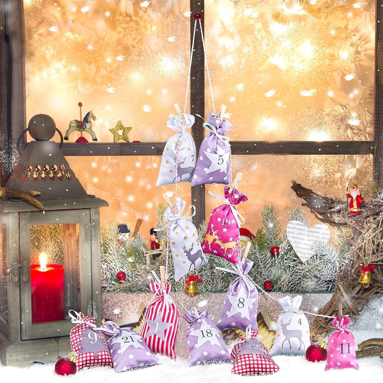 Die bereits aufgedruckten Zahlen auf den Stoffsäckchen erleichtern das Befüllen und sorgen für eine Countdown-Funktion bis Weihnachten. Jeder Tag wird somit zu einer spannenden Überraschung. Die verschiedenen Farben und Muster, wie Hirsch, Weihnachtsbaum und Sterne, machen den Adventskalender noch abwechslungsreicher und persönlicher.