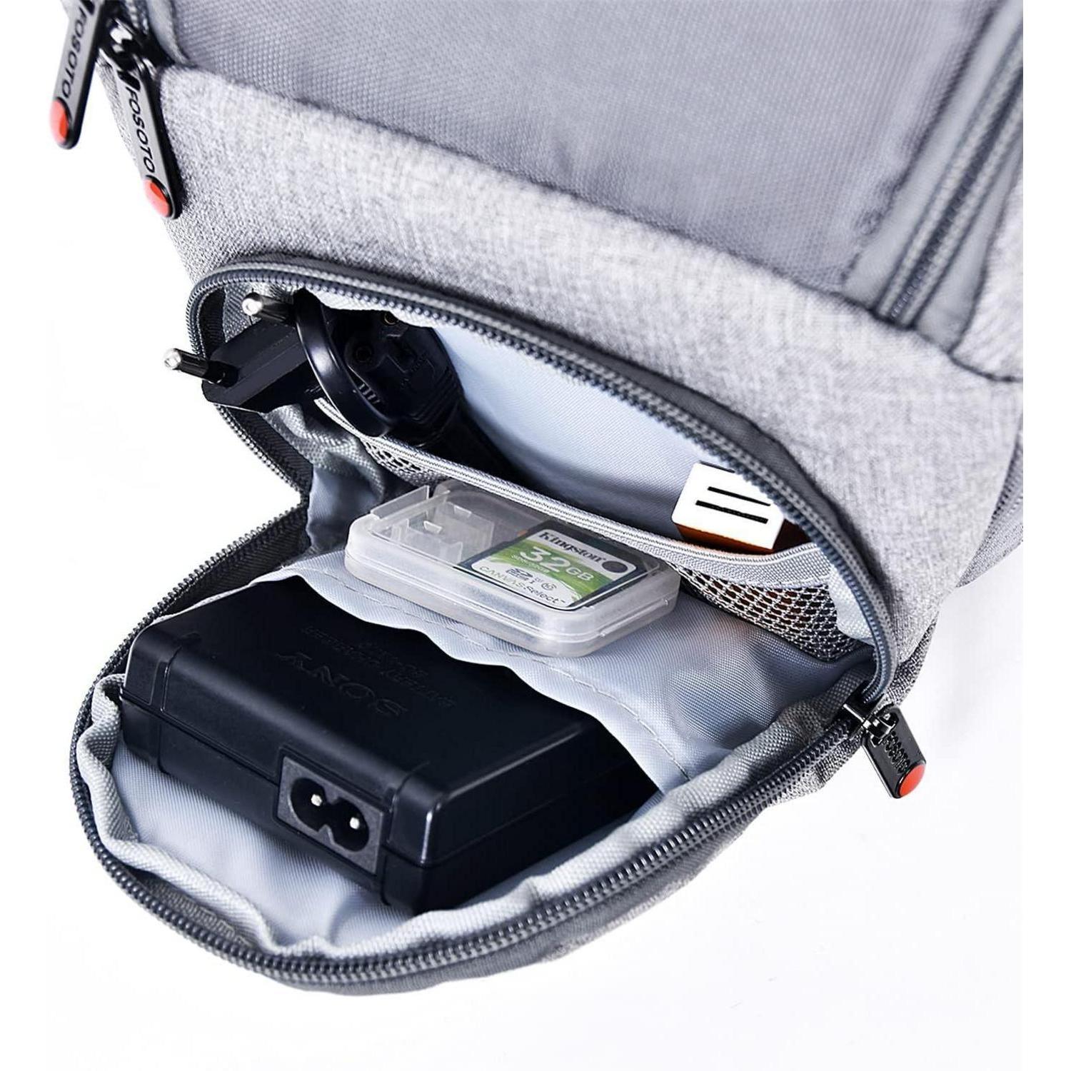 Mit dem abnehmbaren inneren Klettpolster können Sie den Innenraum individuell anpassen, um Kamera und Objektiv sicher zu trennen. Das Hauptfach bietet Platz für 1 DSLR mit 1 Objektiv sowie zusätzliches Zubehör. Die Vorder-, Seiten- und Gesäßtaschen ermöglichen die Organisation von Kabeln, Mobiltelefonen, Batterien, Speicherkarten und vielem mehr.