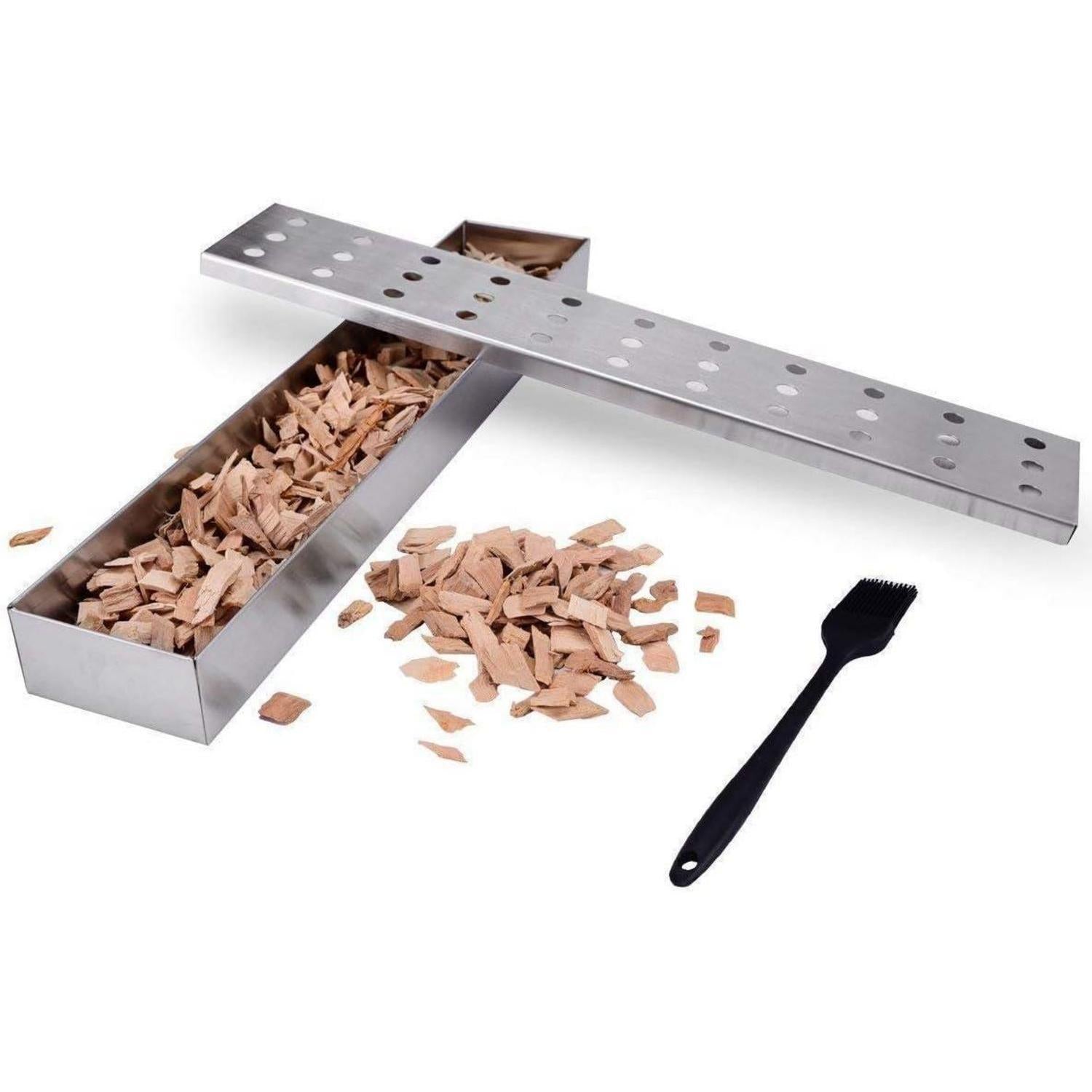 Räucherbox für Gasgrill und Holzkohlegrills, Smokerbox aus rostfreiem Edelstahl für Hickory, Apfel Räucherchips, Grill Zubehör Männer Geschenk, einschließlich Silikonpinsel
