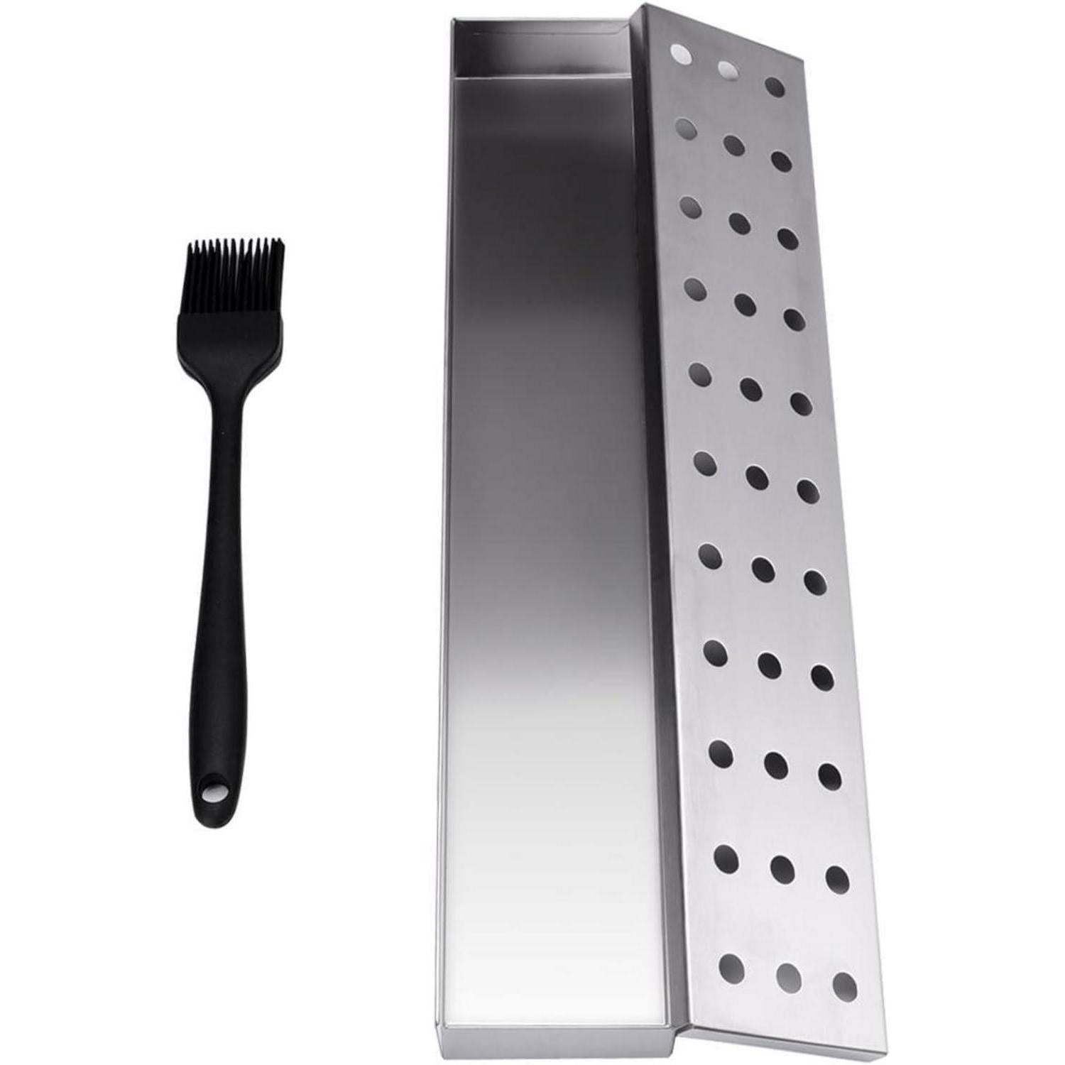 Einen guten Smoky-Geschmack erzielen - Passt gut zu Ihrem Grill und hat gut bemessene Löcher an der Oberseite der Box, damit der ganze rauchige Geschmack der Hackschnitzel in das Essen gelangen kann. Passt perfekt zwischen die Geschmacksstoffe und den Grill und hat sich nicht verzogen. (Einschließlich einer Silikonölbürste)