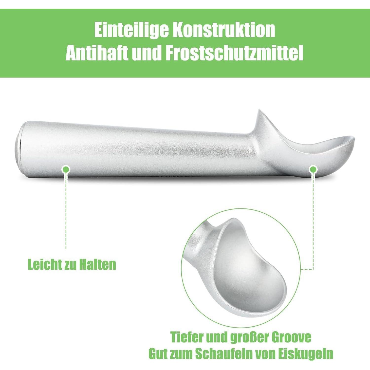 Unser Eisportionierer eignet sich perfekt für die Nutzung mit Eis, Gelato, Sorbet, Wassermelone, Keksteig und vielem mehr. Das Bogendesign ermöglicht ein einfaches Schöpfen der Kugeln, während die hochwertige Frostschutzbeschichtung eine mühelose Handhabung gewährleistet. Die hervorragende Wärmeleitfähigkeit des Aluminiums sorgt für gleichmäßige Kugeln, die jeden Gaumen erfreuen.
