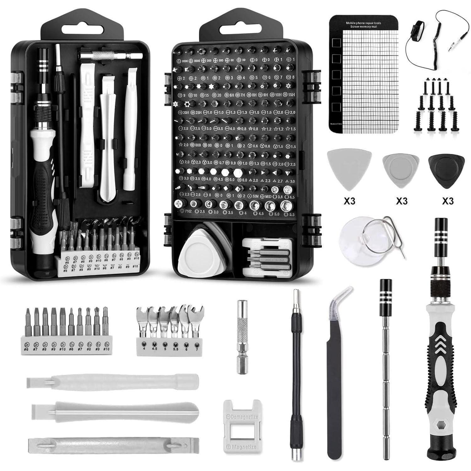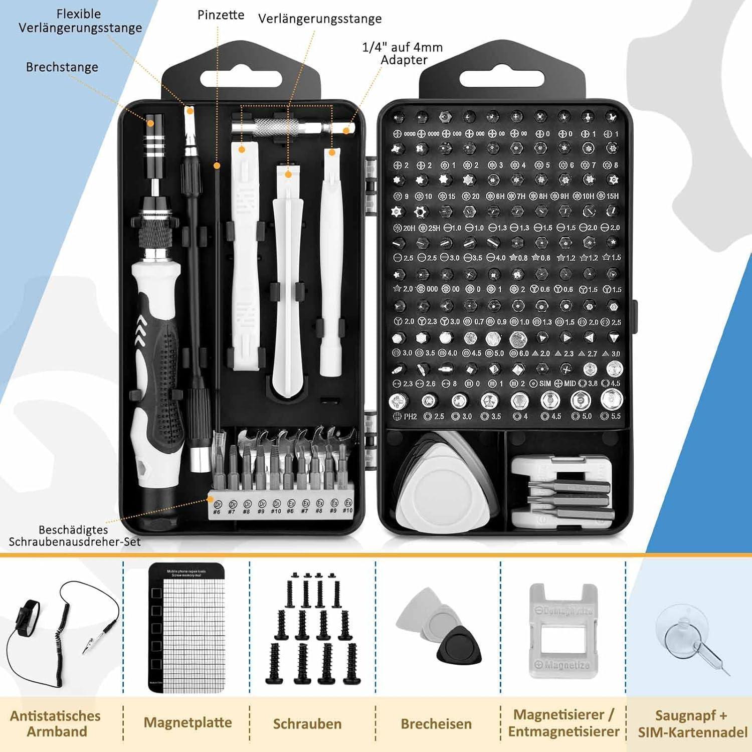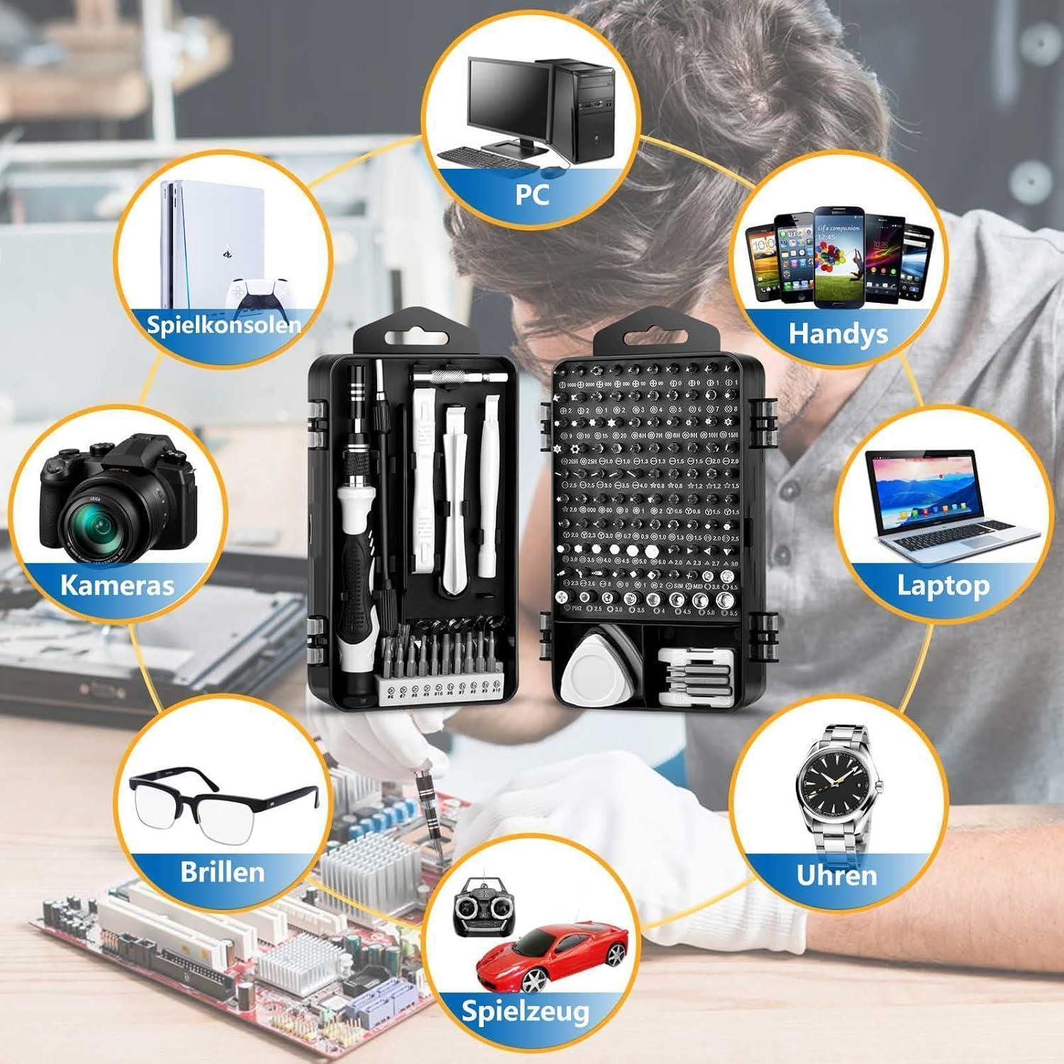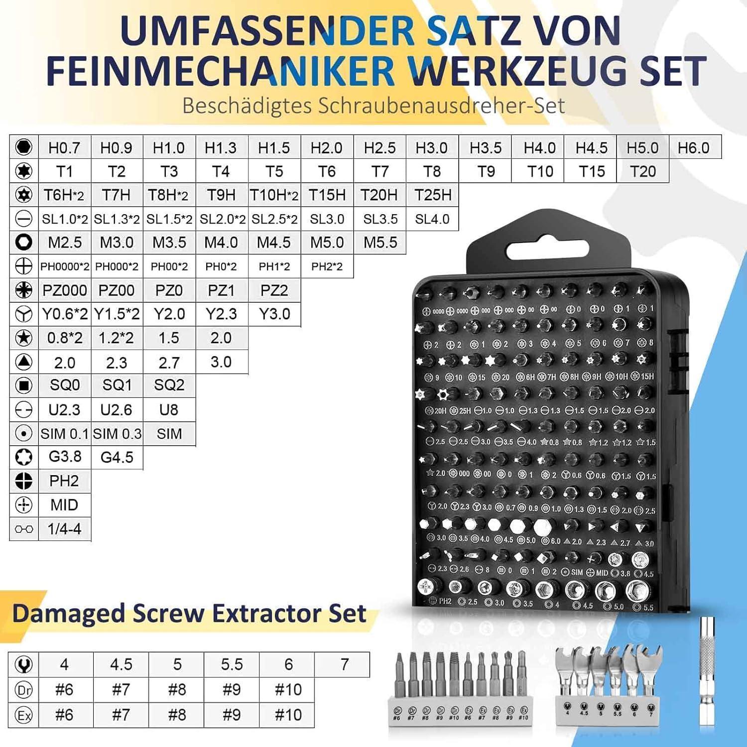 Das Ueznirn Feinmechaniker Werkzeug Set ist ein umfangreiches Set mit 138 Teilen, das Ihnen bei Ihren DIY-Projekten, Handyreparaturen und Laptop-Upgrades hilft. Mit 107 verschiedenen Schraubenzieher-Bits, 10 Spezialbits zum Entfernen abgebrochener Schrauben und einer Vielzahl von Hilfswerkzeugen haben Sie alle notwendigen Werkzeuge griffbereit.