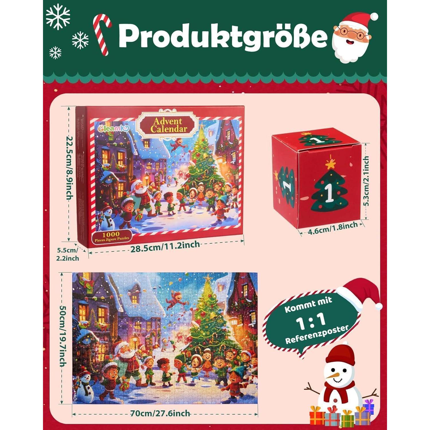 Was enthalten ist: Das Weihnachtspuzzle-Set von Gleamkid enthält eine wunderschön gestaltete Weihnachtsgeschenkbox, hochwertige Puzzles mit 1000 Teilen, 24 farbenfrohe, farbcodierte kleine Boxen und ein hochauflösendes 1:1-Weihnachtsposter; das fertige Puzzle misst 27,6 x 19,7 Zoll und zeigt eine atemberaubende Weihnachtsszene.