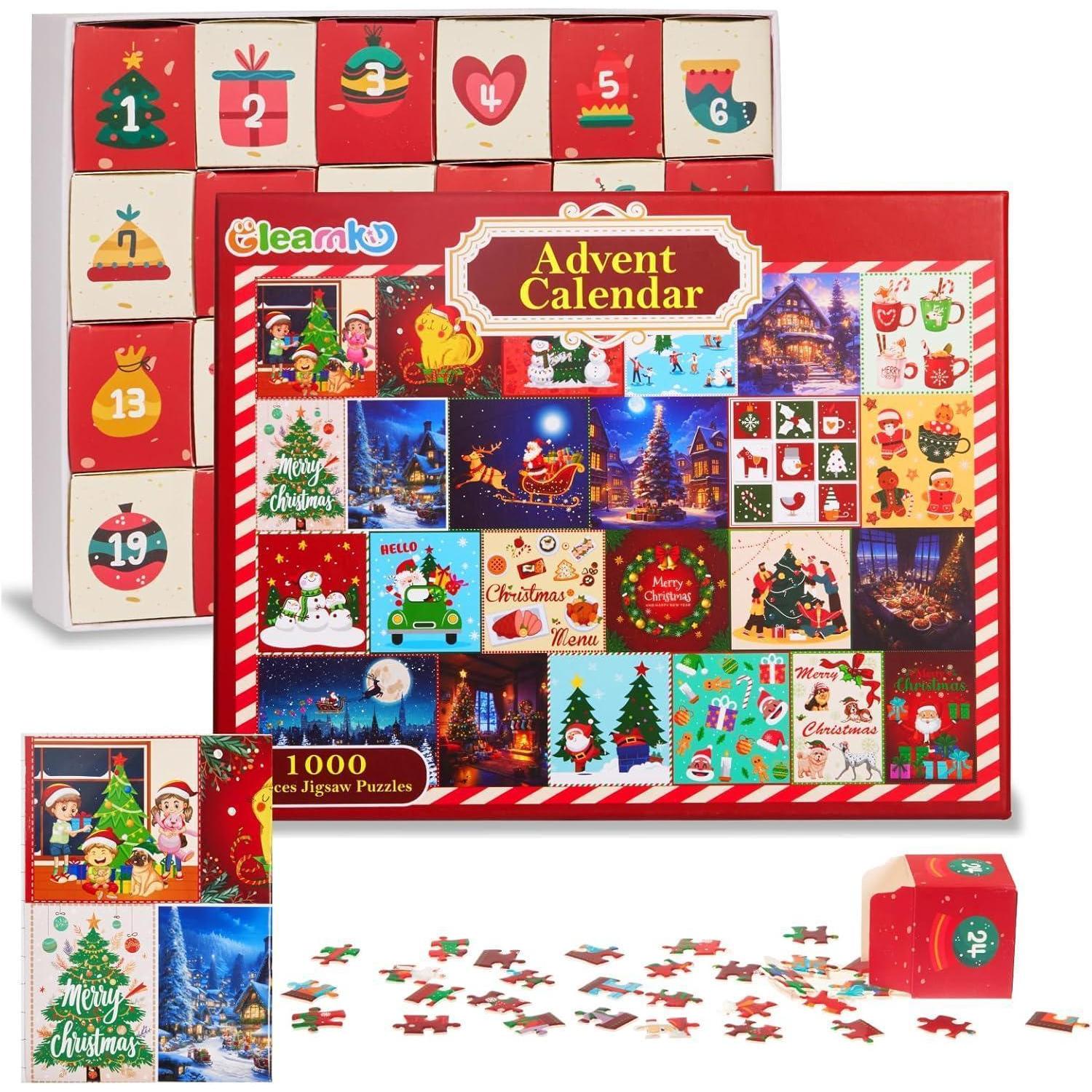 Was enthalten ist: Das Weihnachtspuzzle-Set von Gleamkid enthält eine wunderschön gestaltete Weihnachtsgeschenkbox, hochwertige Puzzles mit 1000 Teilen, 24 farbenfrohe, farbcodierte kleine Boxen und ein hochauflösendes 1:1-Weihnachtsposter; das fertige Puzzle misst 27,6 x 19,7 Zoll und zeigt eine atemberaubende Weihnachtsszene.