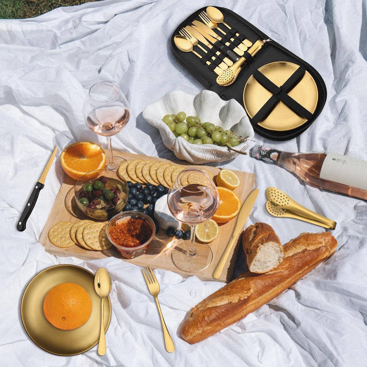 Besteck Set Gold - 10 Stücke Camping Besteck Set für 2 Personen Tragbarer Edelstahl Besteck Set Geschirr Set Mit Etui für Camping Reisen Wanderung Picknicks Outdoor